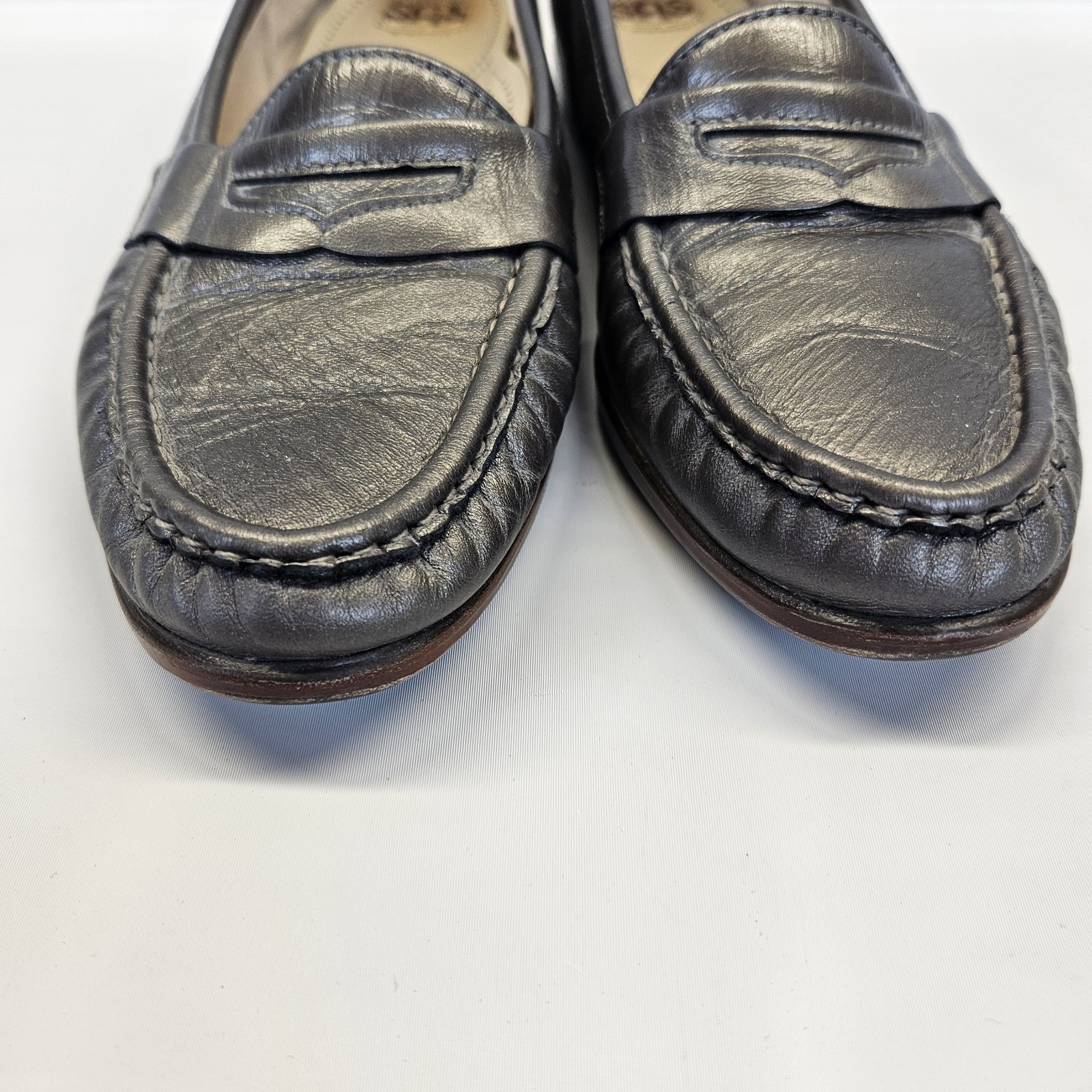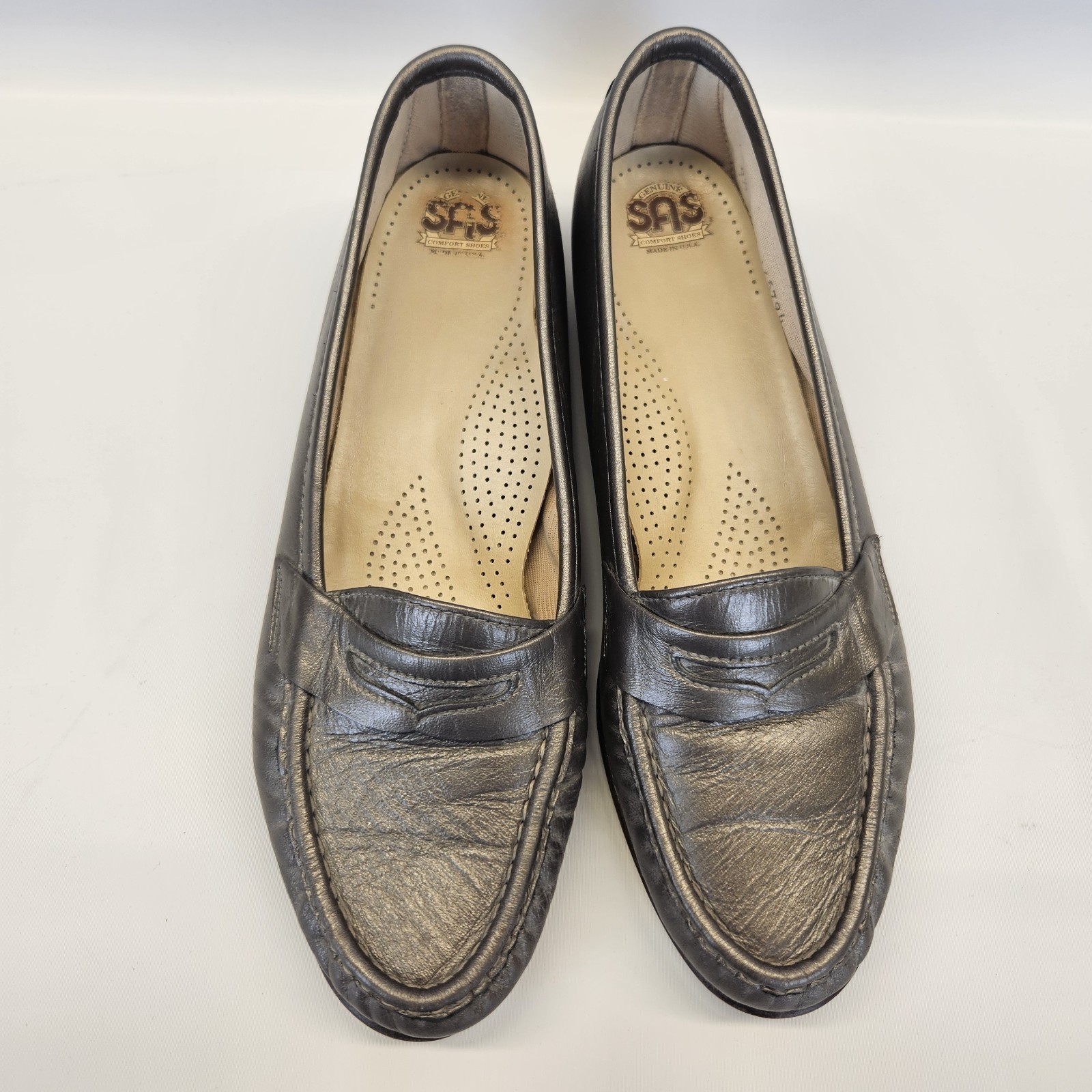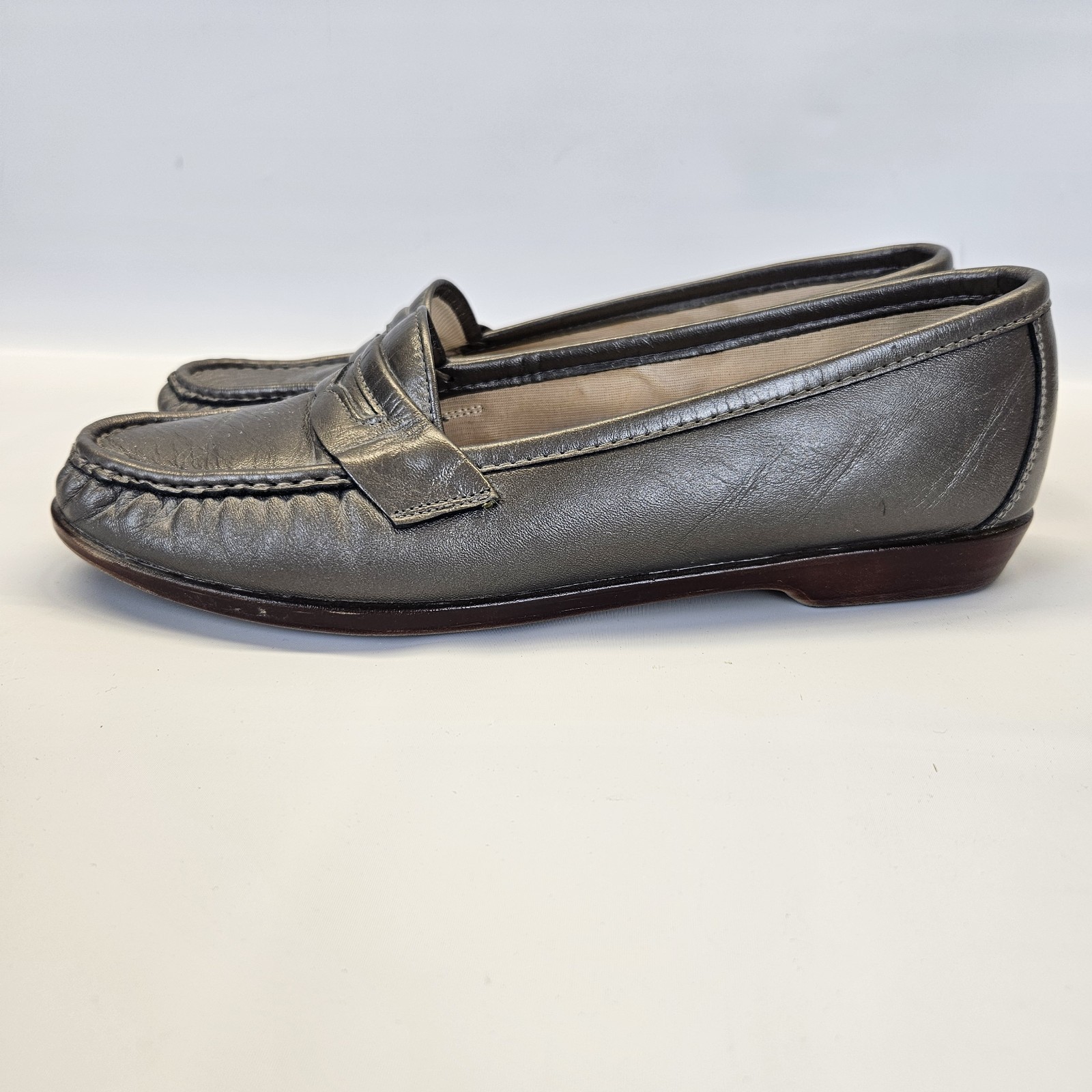 SAS Pewter Silver Gun Metal Moccasin Penny Loafers Shoes Comfort Womens 9.5 Good preowned condition with normal signs of use.