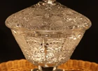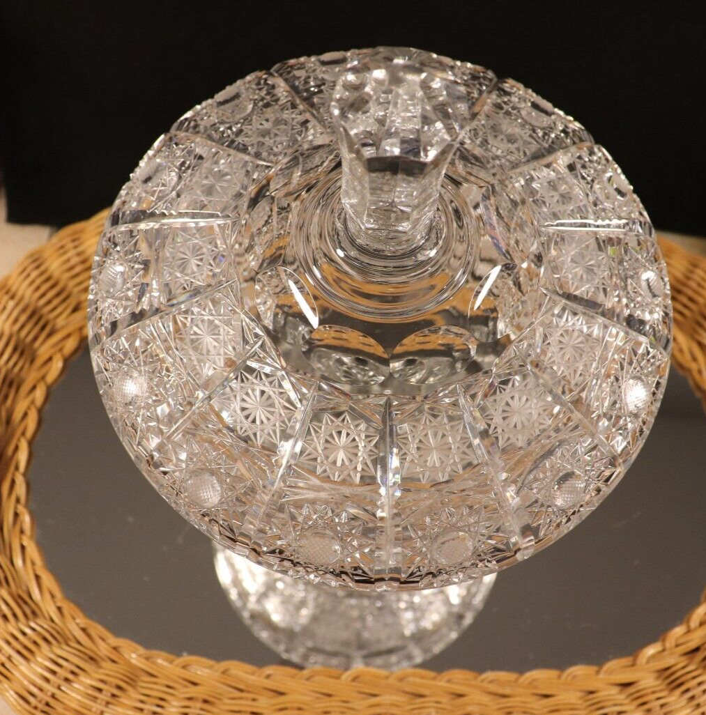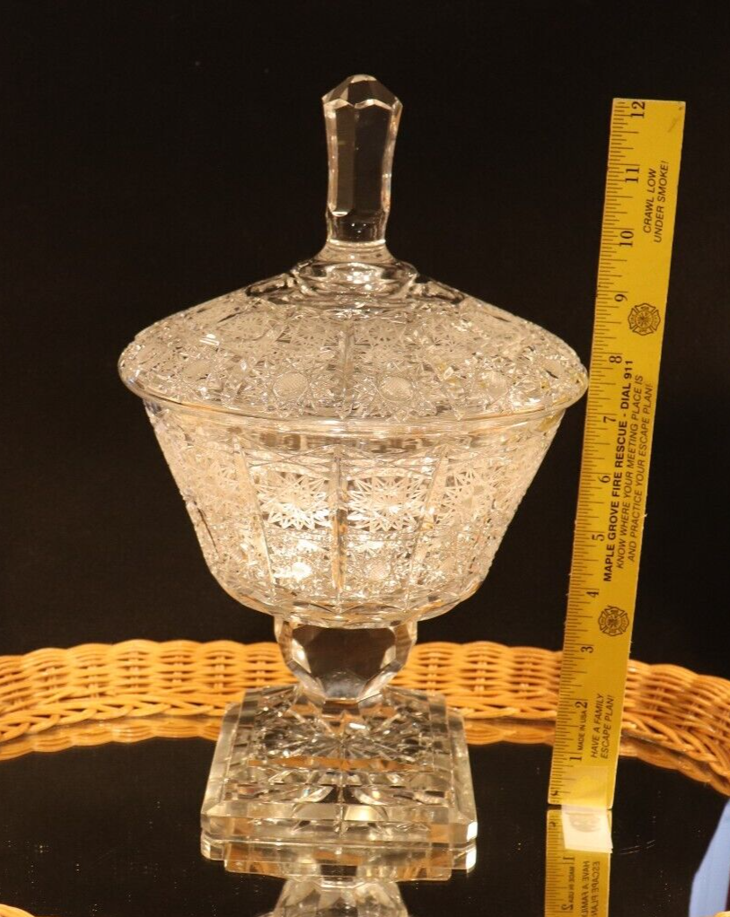 PATTERN IS QUEEN LACE: BOHEMIAN WEIGHS ALMOST 7 LBS: DIA 7-1/4 INCHES WITH THE LID ON 7-1/2 INCHES RARE COVERED CUT GLASS COMPOTE: EXQUISITIVE CUT GLASS A VERY BUSY PATTERN Original/Reproduction: Original Style: BOHEMIAN--QUEEN LACE PATTERN Seller Notes: “IN EXCELLENT PRE-OWNED PRE-DISPLAYED CONDITION. SHOWING ONE EDGE BRUISE--SEE PICTURE” Age: EARLY 20TH CENTRURY Features: EXQUISTIE CUT GLASS Color: Clear Primary Material: Glass Brand: UNBRANDED Material: Glass