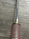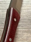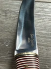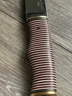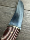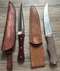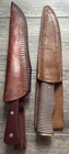 SET OF 2 - SEO CAMP KNIVES KNIFE ONE - FULL TANG CONSTRUCTION, CLIP POINT BLADE OF CARBON STEEL (I BELEIVE), ROSEWOOD SCALES, STAINLESS PINS OVERALL LENGTH OF 12 1/4 INCHES / BLADE LENGTH OF 7 3/8 INCHES / WEIGHT OF 12.04 OZ KNIFE TWO - HILLDEN TANG CONSTRUCTION, TRAILING UPSWEPT BLADE OF 440C STAINLESS, MULTI COLORFUL WOOD HANDLE WITH BRASS PIN, FLUSH GUARD AND BUTT OVERALL LENGTH OF 12 1/4 INCHES / BLADE LENGTH OF 7 3/8 INCHES / WEIGHT OF 8.85 OZ NEVER USED / NEVER SHARPENED / COUPLE MINOR BLEMISHES ON BLADE / LIGHT SCRATCHING / EXCELLENT CONDITION EACH COMES WITH BROWN LEATHER SHEATH