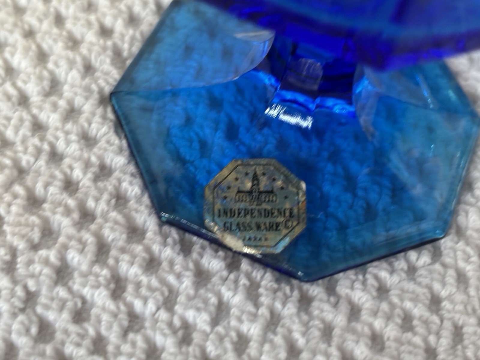 The product is a set of 3 different size vintage cobalt blue Independence glass goblets, perfect for all occasions. They measure 6”, 4 1/2 “ and 4 “ tall. There is still an identifying sticker on the base on one of the goblets. There is a 1/4 mark in the crease of the middle glass that evidently happened during manufacturing. It is not noticeable. These goblets are mid century and make a statement in any table setting. Care instructions recommend hand washing to maintain their beauty for years to come.