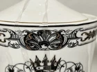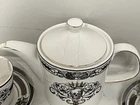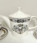 This Grace Teaware custom bundle includes a teapot with lid, two matching teacups, and saucers. The set features a Gothic style with a skull pattern and gold accents. The teapot stands at approximately 6.5 inches tall and has one compartment. The set is perfect for Halloween or any multipurpose occasion. The porcelain material and glossy finish make this set a great addition to any collection. The set is hand wash only and comes unboxed. The Grace Teaware brand is original and not a licensed reproduction. This tea set is a must-have for any Gothic themed collector or tea lover. Be sure to look at my other listings for more pieces that match this Halloween pattern.
