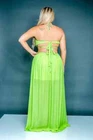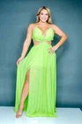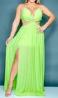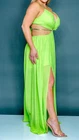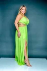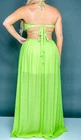 This dress is chiffon lined in a silky 100% polyester. It has a padded bust with an O ring in the center. It ties behind the neck, at the center of the back, and at the back of the golden beaded belt . The waist is elastic. The skirt is lined down to mini length and the outer fabric is long shher with slits. I also have this listed in sizes 2X and 3X and in Ivory. It is a size 1X. Each of the bust cups measure 10 1/2" from top to bottom and 10" wide. The waist measure 35" around and stretches to 58" around. The skirt is 46" long. The length of the lining of the skirt is 19". For a great fit I recommend comparing my measurements to something similar that you have that fits you comfortably. T2