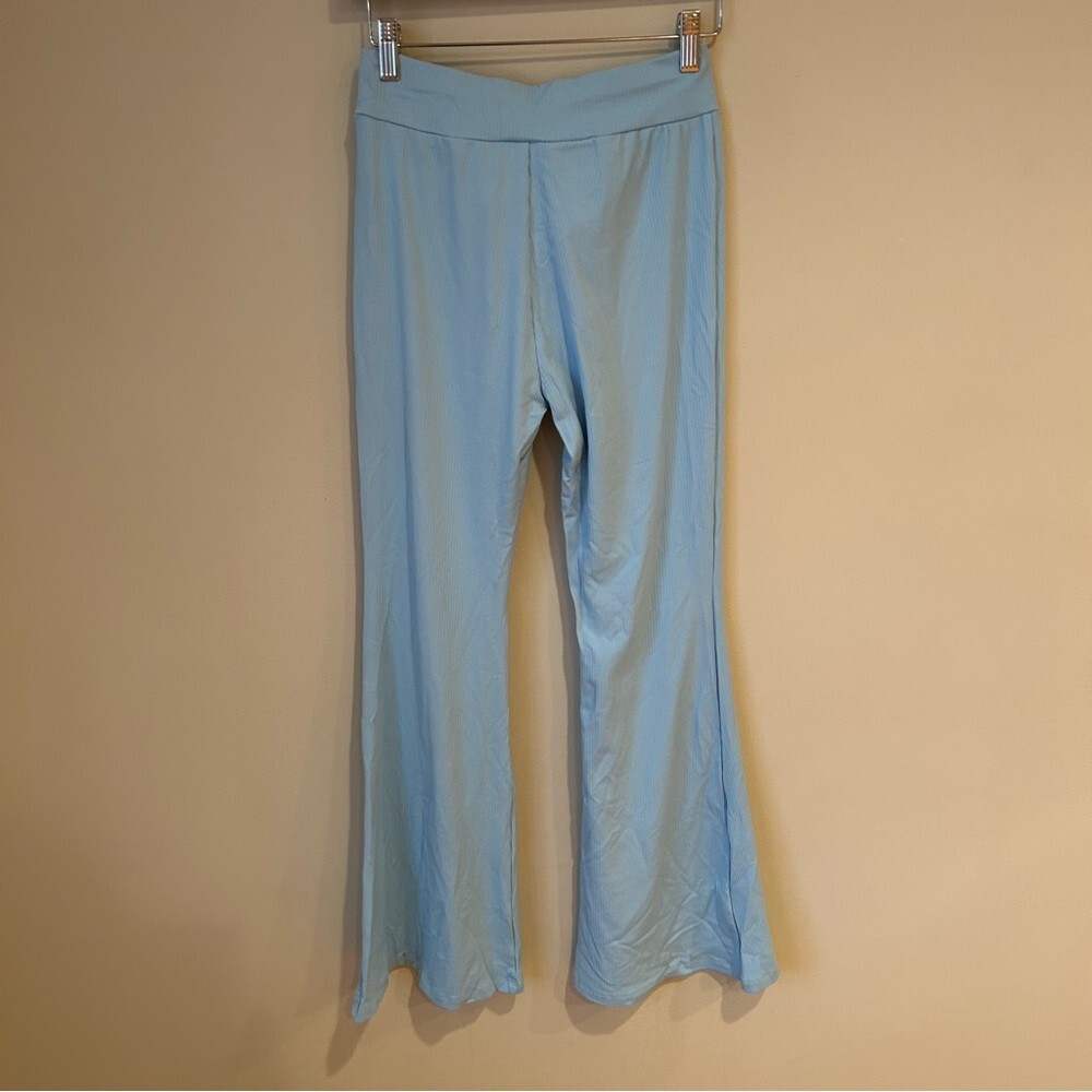 Elevate your style with these chic high-waisted light blue flare pants. Perfect for any occasion, these pants offer a flattering fit and a trendy look. A14