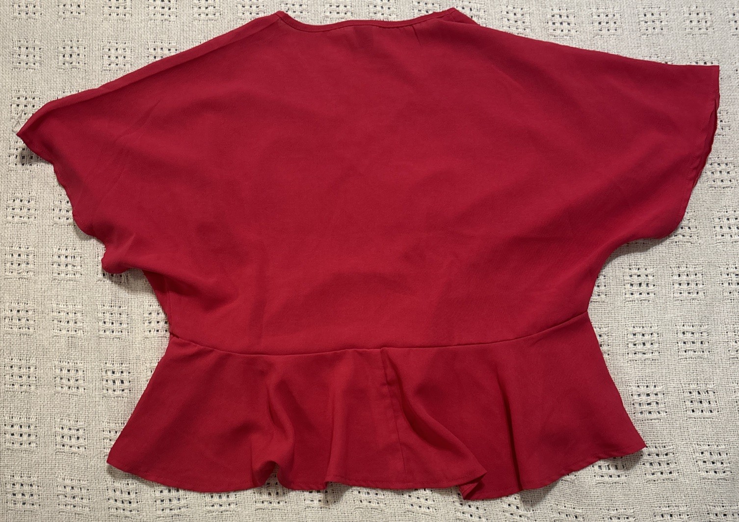 **this is a dark pink/magenta color. The pictures look red but it’s not red** tried to get pictures to show true color but was very hard to do so** This SHEIN women's size small pink blouse features a ruffle hem, short sleeves, and a V-neckline for a stylish and feminine look. Made from lightweight and breathable polyester material, this pullover blouse is perfect for various occasions such as travel, parties, casual wear, and workwear. The pink color and solid pattern add a pop of color to your outfit, while the regular fit ensures comfort and ease of movement. Easy to care for with machine washable instructions, this blouse is a versatile and essential addition to your wardrobe.