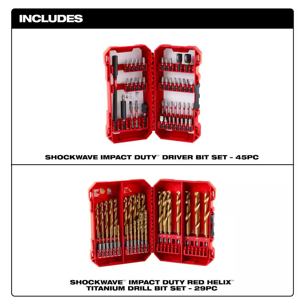Fast Shipping On All Items 30 Days Money Guarantee Customer Support Excellent Service 100% Satisfaction Satisfaction Guaranteed SHOCKWAVE Impact Duty Titanium Drill Bit Set (29-Piece) W/ Steel Screwdriver Bit Set (45-Piece) Specification Bit Material Titanium Drill Bit Type Twist Drill Bit Type(s) Included Twist Features No Additional Features Individual/Set Set Material Application Aluminum,Angle Iron,Duct/Sheet Metal,Stainless Steel,Steel,Wood Number of Pieces 21-30 Pieces Returnable 90-Day Shank Style Hex Tools Product Type Power Tool (n/a) Item Description Ultimate Fit Most durable, SHOCKZONE™ shank absorbs peak torque QUAD EDGE Tip™ delivers precision and stays sharper longer The MILWAUKEE SHOCKWAVE Impact Duty 29PC RED HELIX Titanium Drill Bit Set is engineered for extreme durability and long life. The QUAD EDGE tip delivers a precision start and features four cutting edges to create smaller chips for faster material removal and less heat leading to improved performance. Designed with a VARIABLE HELIX flute that begins with an aggressive 35° helical angle and ends at 15° for rapid chip removal. The bits also feature an internal thicker tapered web that greatly increases strength, reducing premature breakage. Ideal for various applications including but not limited to wood, plastics, and metals. MILWAUKEE RED HELIX Titanium Drill Bits provide up to 5X life vs. black oxide drill bits. Set is organized in a customizable accessory case designed for use in PACKOUT. RED HELIX Technology combines QUAD EDGE tip, VARIABLE HELIX flute, and thicker tapered web QUAD EDGE Tip stays sharper longer VARIABLE HELIX flute designed for rapid chip removal Thicker tapered web design increases bit strength Titanium Coated for 5X Life vs. Black Oxide Drill Bits 1/4" hex shank for use with Impact Drivers and Drill Drivers Ideal for Metal, Wood, & Plastics Laser etched size for easy identification Customizable accessory case is designed for use in PACKOUT Includes: SHOCKWAVE Impact Duty RED HELIX Titanium drill bit set (29-piece) About us We offer the best prices around on high quality products. Our E-store includes media such as books, movies, music and games while offering electronics, toys, sporting apparel, clothing, tools, general home, garden items and more. Shipping We are always working hard to ensure your package arrives as soon as possible. Please understand that some factors like weather, high postal traffic, and the performance of shipping companies are outside of our control. We offer free shipping to the lower 48 states and ship within 2-3 business days of payment, usually sooner. We do not accept P.O. Boxes. Please provide a physical address. For shipping outside of the continental USA, we only use eBay's Global Shipping Program.The item is shipped to KY and then sent to the rest of the world. International customers are responsible for all duties and taxes. Continue to check out to calculate costs for shipping the item to your country. Messages regarding eBay's Global Shipping Program MUST be directed at eBay EXCLUSIVELY. Returns We offer a 30-Day Return Policy on items in which you are not completely satisfied with. You have the option of a full-refund or an exchange of the item. No returns are available on items shipped outside of the USA Satisfaction We try over very best to make sure every customer is completely satisfied. If there's a problem, message us! We're happy to help. Payment Options Shop With Confidence