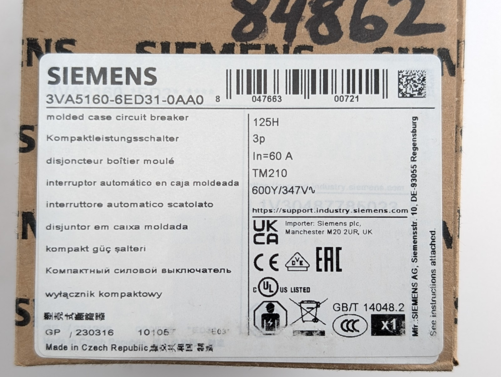 SIEMENS 3VA5160 6ED31 0AA0 3 Pole 60 AMP 3VA5 Frame 125H New in box. Packaging may be slightly worn from storage.