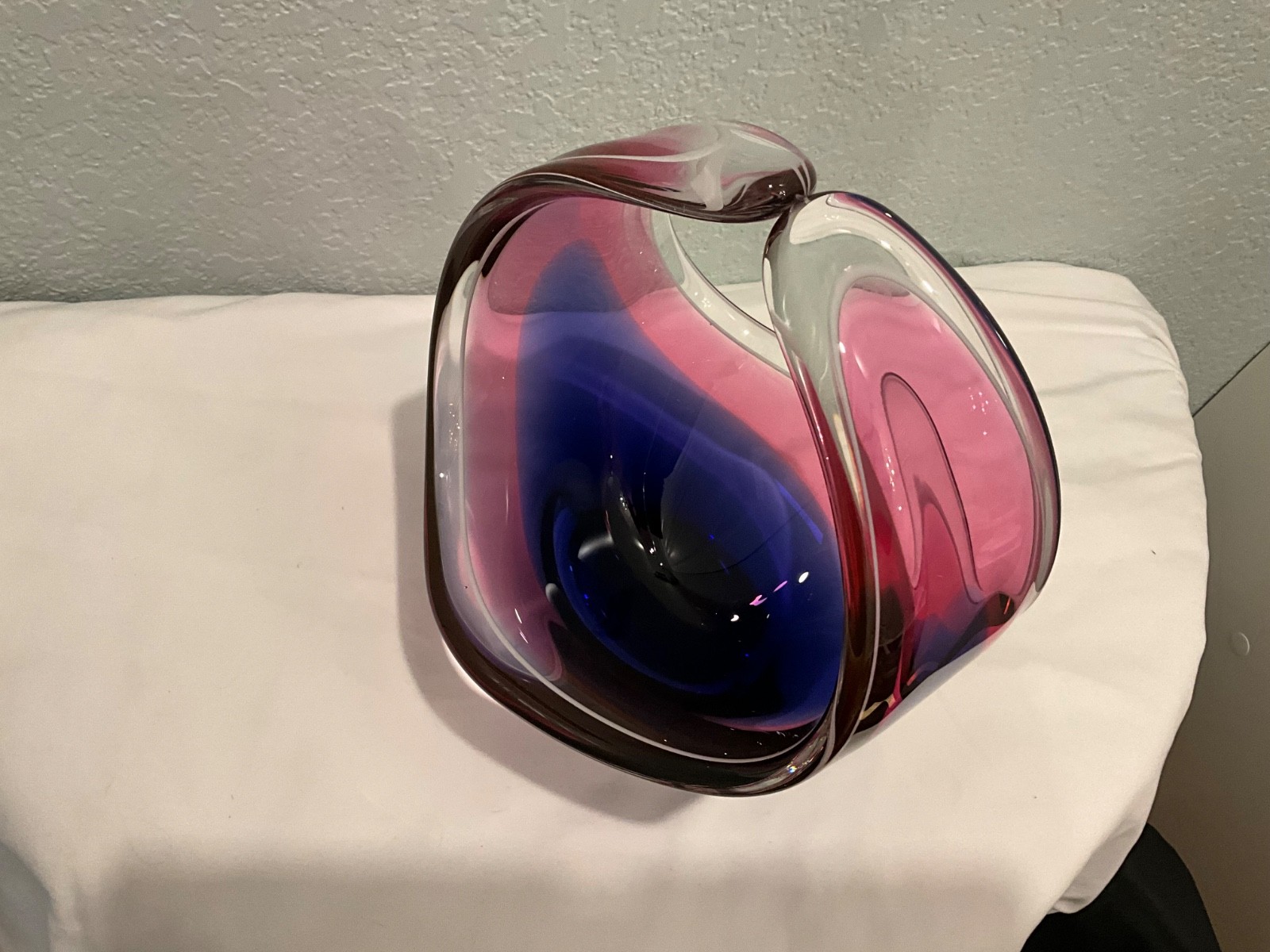 The SIGNED Flygfors Coquille Swedish modern handled glass bowl by Paul Kedelv is a beautiful and elegant piece of glassware. With a pink color that has deep purple/blue center and a unique Coquille pattern, this 12" x 8" bowl with unusual hand-blown handle is a perfect addition to any home decor. The signatures on the bowl add authenticity and sophistication to this modern and stylish piece. It is signed on the bottom with both “Flygors and Coquille”, you can be assured this is an authentic piece.