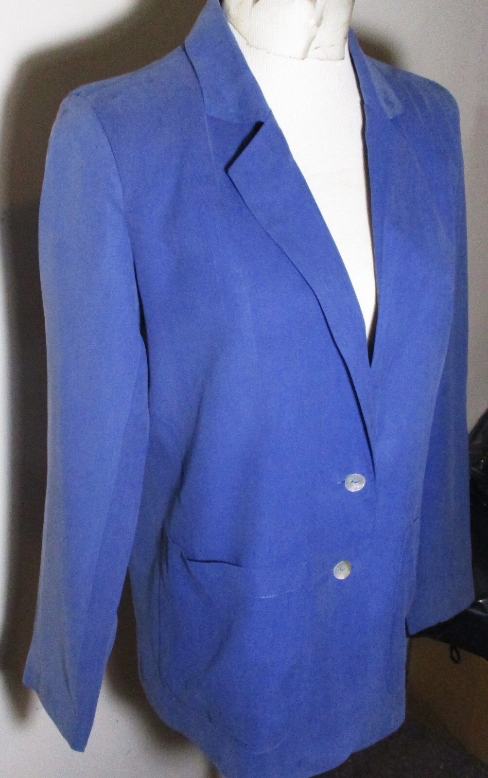 See my EBAY STORE at “SAMTPC53” to view 100’s more of my Women's JACKETS!!! Combine Shipping: (on multiple items you pay full price on heaviest item first and then HALF PRICE shipping on ALL other items. Women's 100% Silk Blazer Jacket. Brand: WINTER SILKS. Description: women's 100% Silk WINTER SILKS blazer jacket, lining, buttons on front, side pockets, padded shoulders, see pics. Color: Blue. Size: S (please see measurements). Measurements: 19" armpit to armpit, 15" back shoulders, 26" shoulder to hem, 18" insleeve, 24" outer sleeve. Material: 100% Silk, Lining- 100% Acetate. Condition: Excellent condition, NWT.
