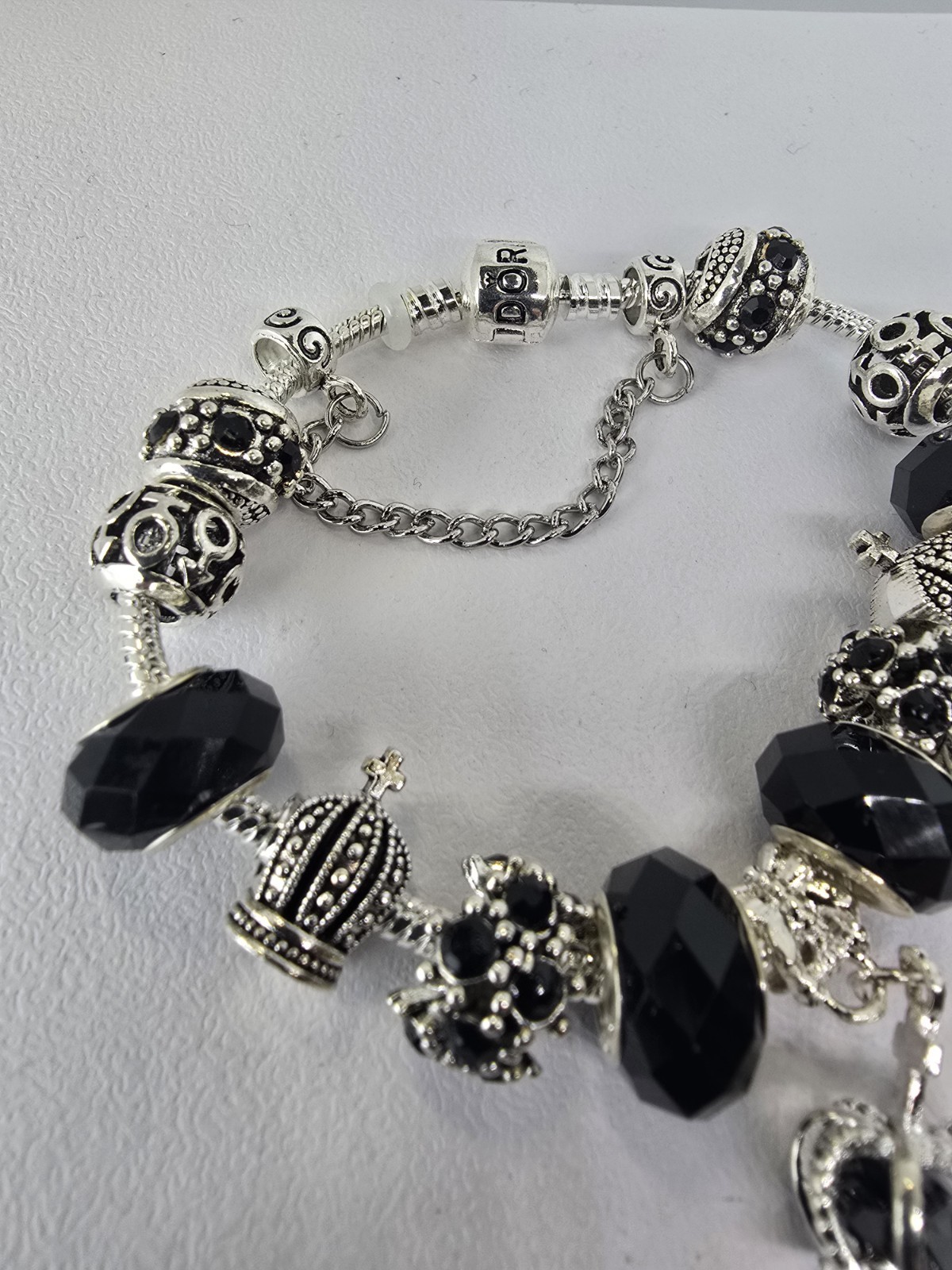 Please note: Only the Sterling Silver Bracelet is Authentic Pandora. The charms are European style. Remove jewelry before going to bed or participating in physical activity.Exposure to harsh chemicals will result in tarnish of your jewelry,Also perspiration,perfumes,hand sanitizer,chlorine,salt water and silver polish must be avoided. Thank you. This silver bracelet features a crystal crown charm adorned with cubic zirconia stones, symbolizing love and elegance. With a European charm design, this 7.5-inch bracelet is accented with a black crystal main stone and a buckle clasp. Made with zinc and brass metals, this branded piece of fashion jewelry is perfect for adding a touch of charm to any outfit. Perfect for those who appreciate intricate details and a touch of romance in their accessories. Made in Thailand, this bracelet is a stylish and unique addition to any jewelry collection. Remove jewelry before going to bed or participating in physical activity, showering, and swimming. Exposure to harsh chemicals will result in tarnishing, fading and discoloring of your jewelry along with perspiration, perfumes, hand-sanitizer, chlorine, salt water, and silver Polish all must be avoided. BEADS & CHARMS ARE NOT PANDORA! IN USING SILVER PLATED/TONED CHARMS THIS KEEPS THE PRICE AFFORDABLE! WHEREAS IF YOU WERE PURCHASING ALL PANDORA CHARMS & BEADS YOU WOULD BE AROUND $800 AND UP!! Each & every bracelet will either have a threaded charm or safety chain, clipped charm, or rubber stopper to hold all charms in place! All of these are easy to remove so you can add, remove, or switch out charms at any given time!
