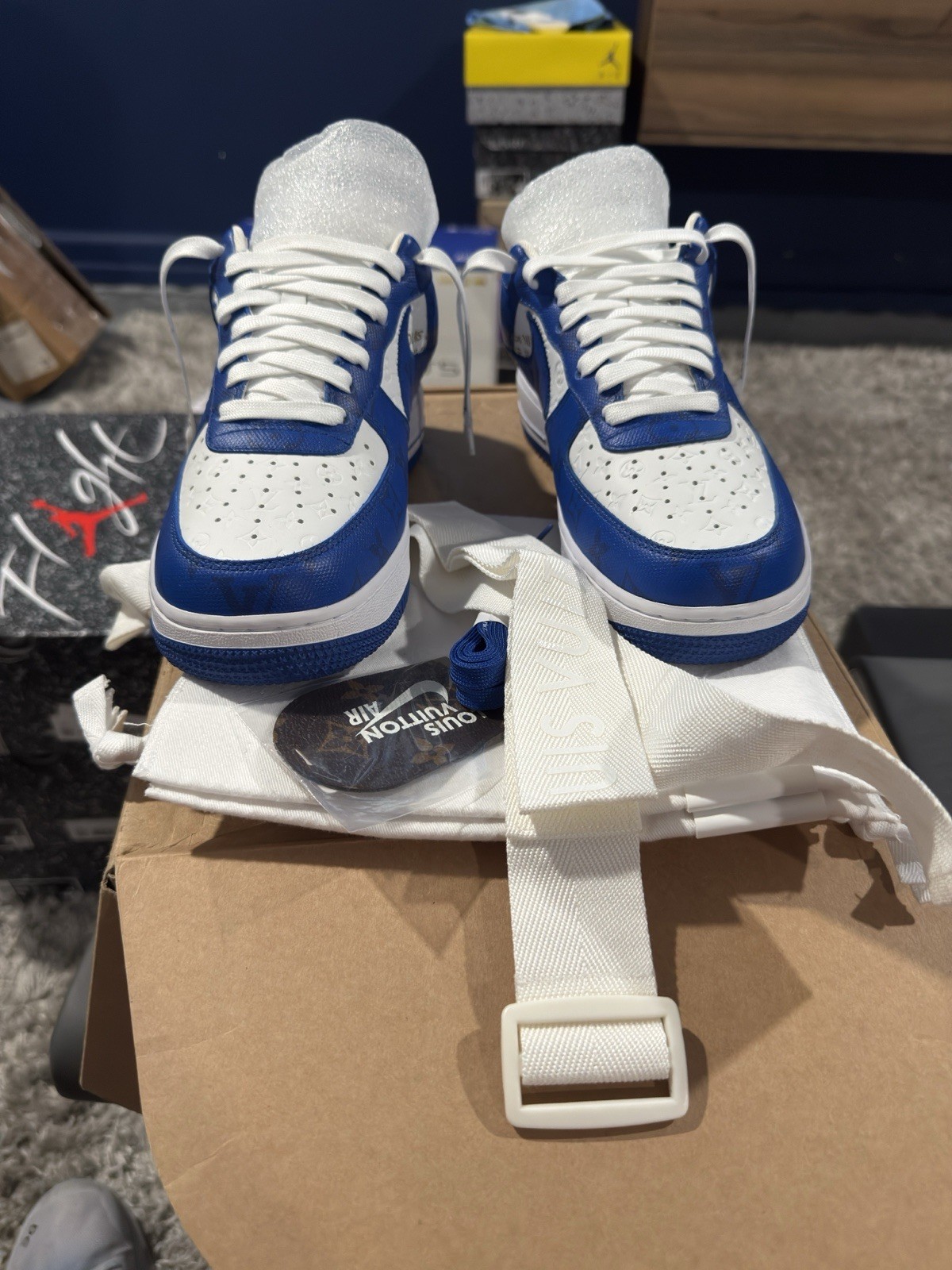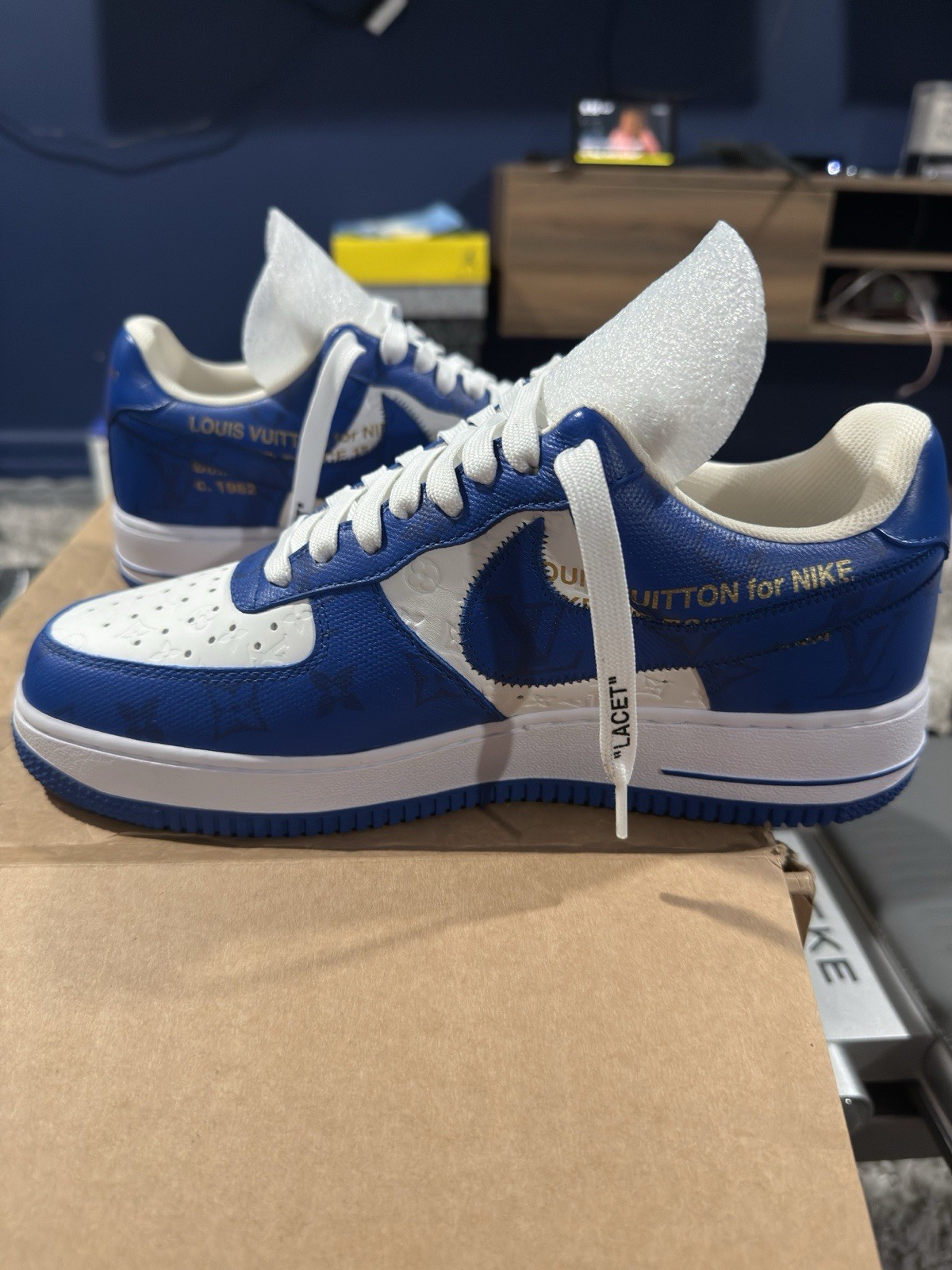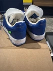 The product is a size 8.5 UK (8.5 US) pair of brand new Louis Vuitton x Air Force 1 Low sneakers in White Team Royal. These athletic shoes feature a low top shaft style, leather upper material, and are custom designed by Louis Vuitton. The sneakers have a royal blue color scheme and are part of the Air Force One product line. Made in Italy, they are ideal for basketball performance and are a stylish addition to any men's wardrobe.