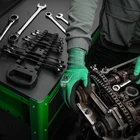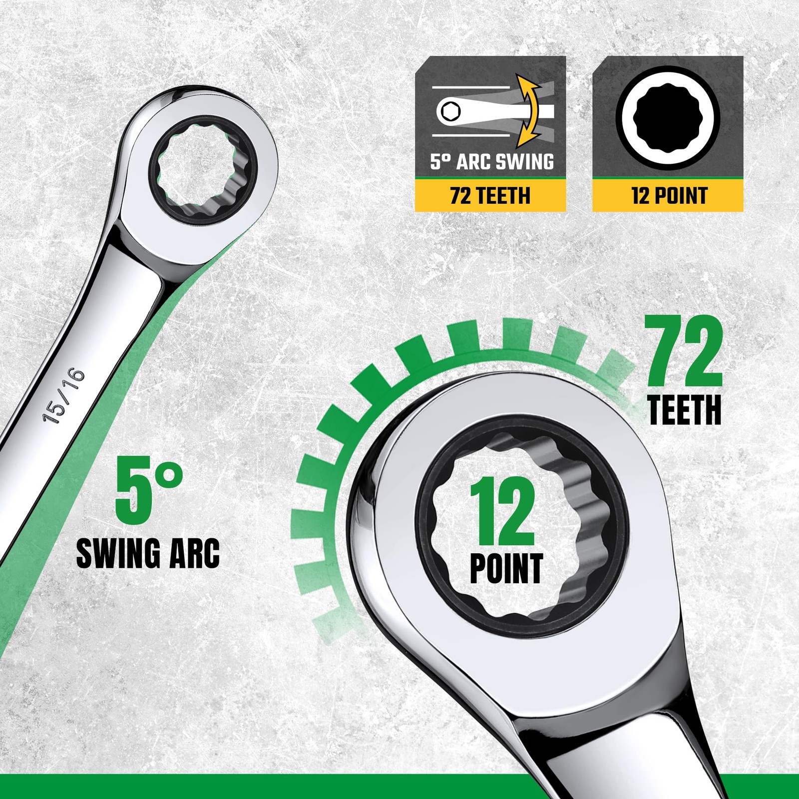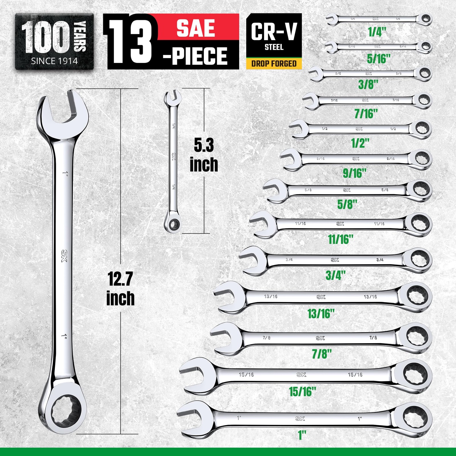 SK Ratcheting Wrench Set, Combination Wrench Set, 13-Piece, SAE 1/4" to 1", 72-Tooth, Premium CR-V Construction, with Rack Organizer SK wrenches are made from drop forged chrome vanadium steel for maximum strength and durability. Chrome plating delivers a premium finish for providing long life and maximum corrosion resistance The 72-tooth ratchet gear has a slim profile requiring only a 5-degree working swing arc for tight spaces. 12-point full-drive box end provides a firmer grip and improved torque, making it easier to tighten and loosen any bolt or nut, without rounding The open end chamfered design makes it easier to insert the wrench into the bolt. Off-corner loading design drives the side of the fastener, not the corner, to provide increased fit and avoid rounding of rusted or damaged fasteners The 12 Point ratcheting wrench set includes: SAE 1/4 ", 5/16 ", 3/8 ", 7/16 ", 1/2 ", 9/16 ", 5/8 ", 11/16 ", 3/4 ", 13/16 ", 7/8 ", 15/16 ", 1 ", with visible size for easy identification Combination wrenches come with a marked organizer rack designed for safe storage and easy access. Each holder features clear specifications for the corresponding wrench size, allowing you to quickly find the size you need