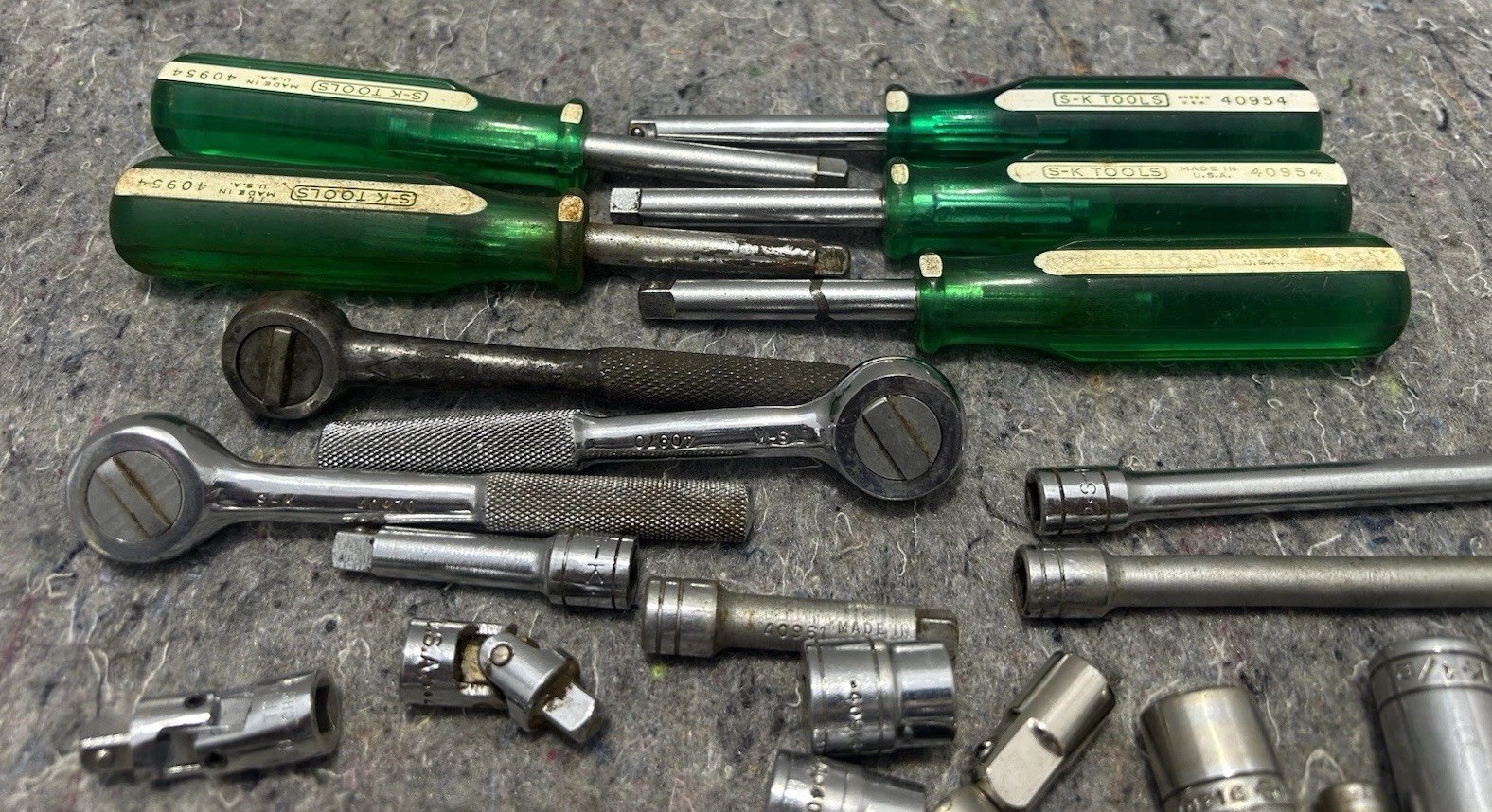 Storage unit find. Recycling items found in abandoned storage units at auction. Large lot of S-K Tools S-K Wayne USA 1/4” drive sockets, ratchets and drivers. Deep and shallow, 6 point and 12 point SAE and Metric. Please review all photos for condition of exact items included in this auction, items being sold as is as found. See my other auctions for more great vintage and rare tool finds.
