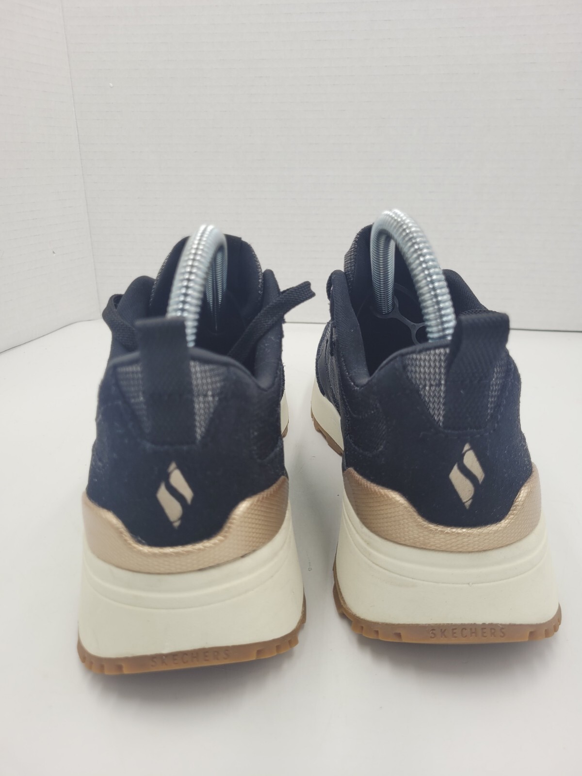 Elevate your casual look with these stylish SKECHERS Sunny Street sneakers. Crafted in Italia with a solid black color and a sleek design, these sneakers feature a shoelace closure and a comfortable leather outsole. The upper material is made of fabric and the lining material is also leather, providing a luxurious feel for your feet. These women's sneakers are perfect for fall and can be worn for any casual occasion. The CUISSARD style of leg and the E shoe width make them a versatile addition to your wardrobe. The SKECHERS Street product line ensures that you get the best quality and durability. Buy now to add these stunning sneakers to your collection! T
