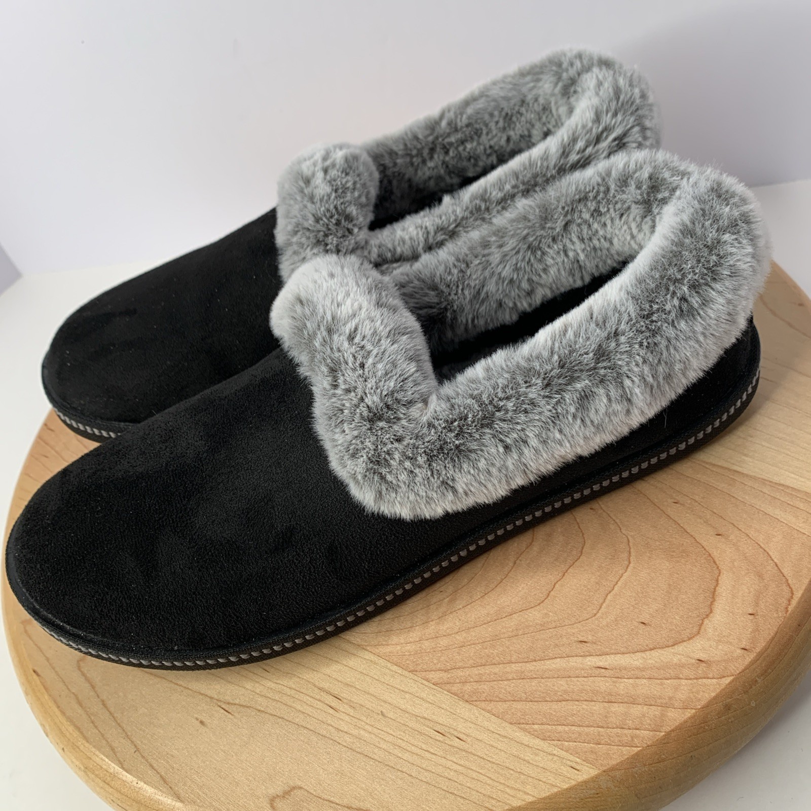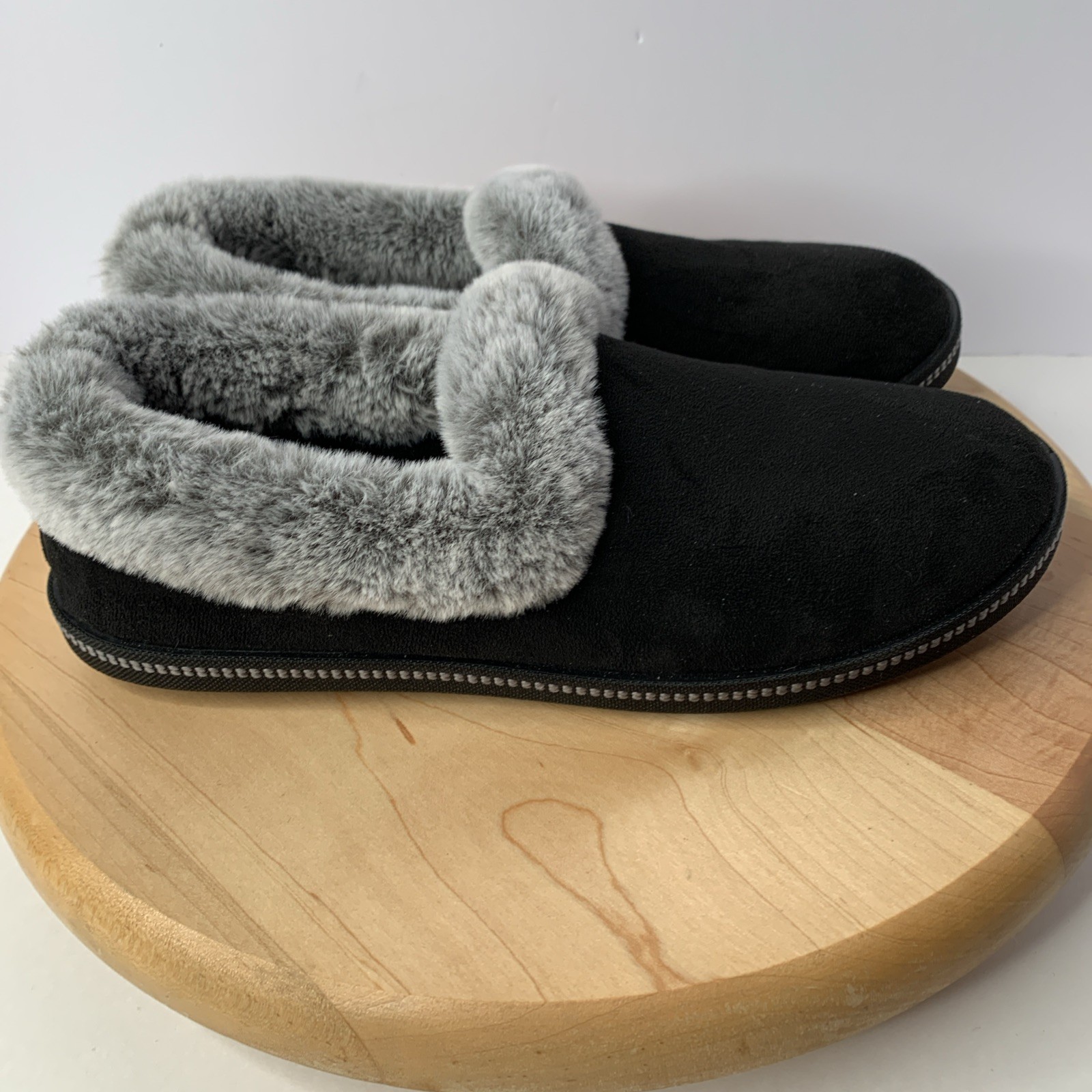 The SKECHERS Womens Size 8.5 Cozy Campfire Slipper in Black/Grey is a stylish and comfortable slipper perfect for casual occasions. Featuring a round toe, slip-on closure, and low heel height, these slippers are made with faux suede fabric and lined with cozy faux fur. The memory foam insole provides added comfort, making them ideal for the winter, fall, and spring seasons. With accents like fur trim and the Skechers logo, these slippers also have a rubber outsole for stability. Escape the cold with these cozy and snuggle-worthy slippers from SKECHERS.