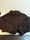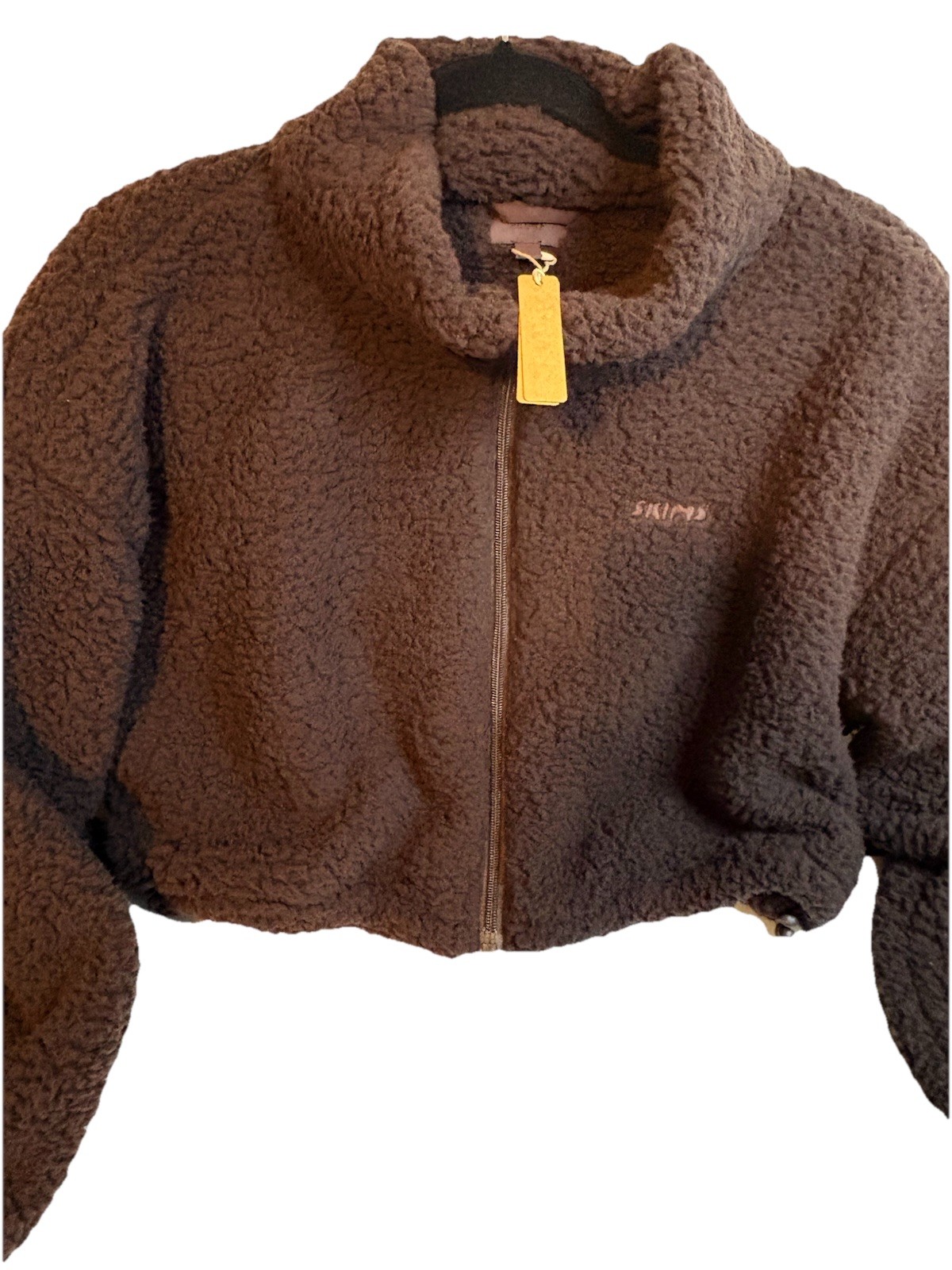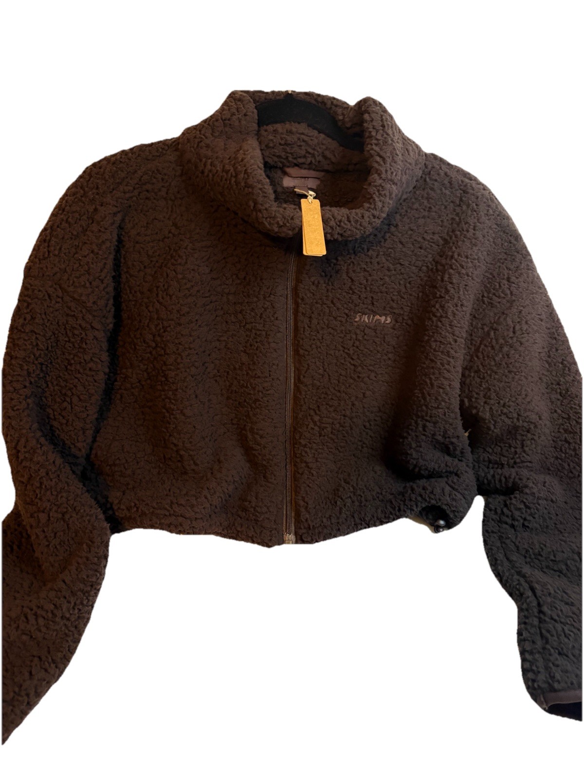 SKIMS Teddy High Pile Fleece Cropped Zip Jacket in a brown color, likely "Cocoa", "Espresso", "Umber", or "Chai". It is part of the brand's popular loungewear and outerwear collections. Product Details Brand: SKIMS Material: Made from a soft, high-pile polyester fleece (faux shearling). Style: It features a cropped length, full-zip closure, funnel or mock neck collar, and often includes side zipper pockets and an adjustable bungee cord at the hem for a customizable fit. Color: Various shades of brown are available, including Espresso, Cocoa, Umber, and Chai/Desert. Size Large New without Tags ✨ Shipping the Same Day 📦 Shipped with care 🔄 30-Day Free Returns (under not as described 💖 Thank you for shopping at Karo’s