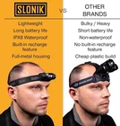 POWERFUL: Equipped with 1000-lumen CREE LED lights, our upgraded SLONIK 2nd generation hiking gear head lamp can cast a super bright 60-foot beam for long-range illumination at night. 6 levels of brightness to accommodate all situations. HEAVY DUTY: These dust and waterproof headlamps for adults are must-have camping supplies and night hiking essentials. The head light sports an aero-grade aluminum construction designed to handle extreme conditions. MULTIPURPOSE: Utilize these camping lights in many different ways! Use as a handheld flashlight, attach it to the adjustable nylon band for a comfortable fit around the head, mount it as hard hat light using the provided hooks, or affix to any metal surface with the built-in magnet. RECHARGEABLE: Don't be left in the dark ever again! Have this bright rechargeable headlamp ready to go when you need it. Each light comes with a 2200mAh battery for hours of use and a convenient micro-USB cable for charging. ESSENTIAL: Not only is this LED headlamp rechargeable, it’s also versatile. Applications for this are both personal and industrial: outdoor running, bike trails, walking the dog, as hunting and fishing supplies, night hiking gear, or hard hat accessories for a construction helmet.