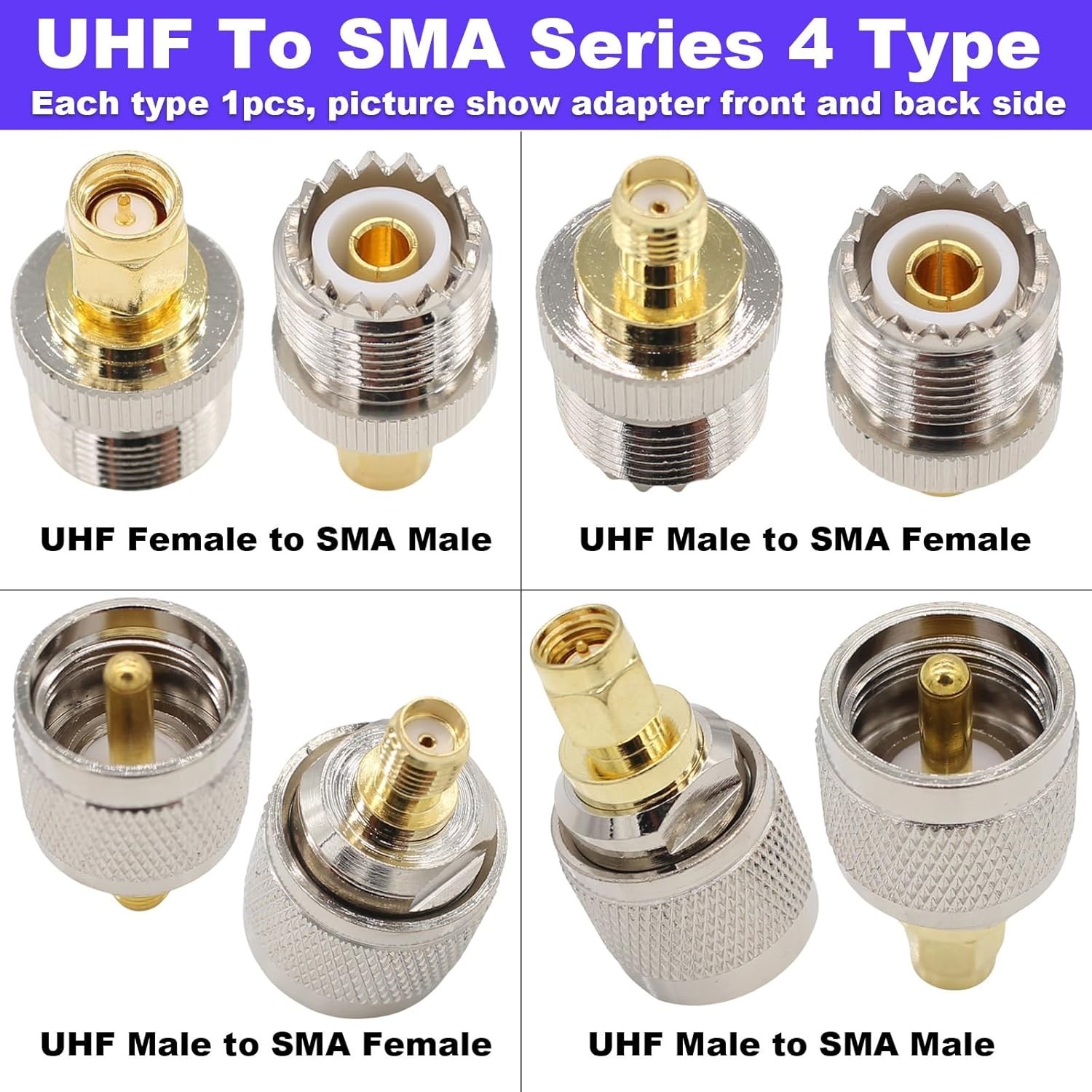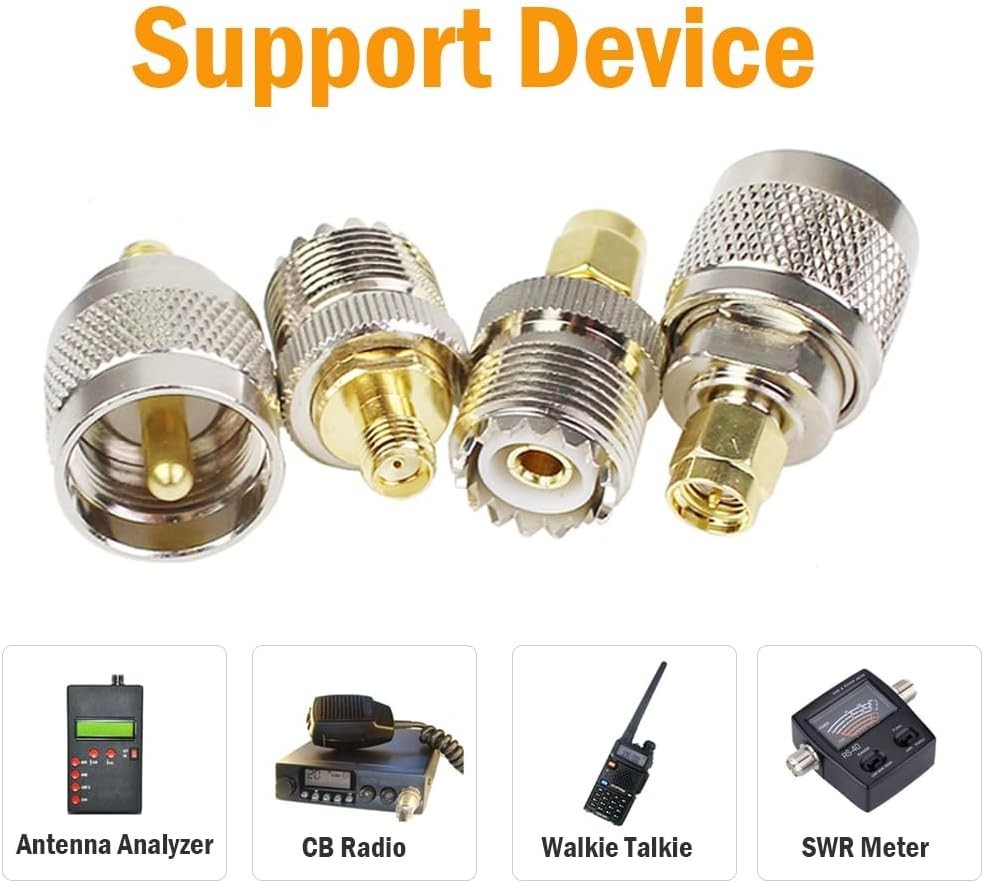 About this item This UHF FR Coaxial Connector Kit Contains 4 Type SMA UHF Adapters. ( SO239 Male Plug to SMA Male Adapter, SO239 Male Plug to SMA Female Connector, SO239 Female Plug to SMA Male Adapter, SO239 Female Plug to SMA Female Connector) This SO239 SMA Adapter Set is constructed from durable copper and gold-plated for maximum conductivity and corrosion resistance in all weather. Impedance 50 ohm, Low Loss. This SO239 SMA Adapter Set is well made fit for all the possible needed connections from a Ham handheld GMRS radio SMA fitting to the UHF antenna connector. some ham radios use a male SMA connector and some a female. SMA-UHF Coaxial cable connectors is compatible with SWR/CB Radio / Handheld Ham Radio Antenna / Walkie Talkie / Amateur radios / mobile ham radio / sdr dongle / NanoVNA and so on Suitable for Antennas, Wireless LAN Devices , Coaxial cable, Wi-Fi Radios External Antenna and so on