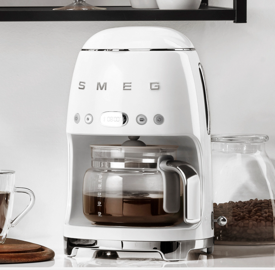 Serve delicious drip coffee with a splash of style. Italian-based SMEG is known for '50s retro-look appliances designed in collaboration with some of the world's top architects. This SMEG drip coffee maker combines iconic midcentury style with convenient features like auto start and aroma control, so you can brew a cup tailored to your taste and schedule. Choose from two aroma settings to create your preferred coffee strength: Delicate (default) or Intense. Auto Start feature lets you set a time to begin brewing, so you can wake up to your favorite brew. 1–4 cup setting for brewing smaller quantities. Easy-to-use LED control panel has digital clock display. 10-cup glass carafe; lid for carafe opens further back. Keep Warm plate automatically keeps coffee warm for 60 minutes. Option to turn off audible sound. Model #DCF02 9 3/4" x 10" x 14 1/4" high. 7 lb. 8 oz. 1 1/2-qt. (1.4-liter) water tank. 1050W. This product is intended for use in the United States and Canada, and is built to U.S. electrical standards. Made in China. Additional Information Permanent filter. Clear water level indicator lets you easily see how much water is in tank. Anti-drip valve system located on filter holder. Three water hardness settings. Decalcify signal indicates when it's time to descale coffee maker using automatic descale cycle. Steel with powder-coat enamel finish resists scratches, stains and corrosion. Nonslip feet. Plastic chrome handle and base. Includes measuring scoop.