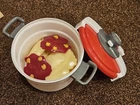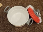 This listing is for a cute Toy Pressure Cooker with the words mini Tefal on the front of cooker, made by Smoby Toys Pressure cooker lid can be removed and there is a pretend steam release toggle on the top that child can turn. Pressure cooker measures approx. 7" diameter with a height of approx. 4.5". Also included are a play colander, play rolling pin, 2 play spaghetti pieces, 2 play ravioli pieces, & 2 pizza sauce pizzas that can be placed on either Spaghetti or ravioli. All items are in very nice condition. GENERAL INFORMATION My items come from a clean, smoke-free home. I ship my items very quickly and if possible I ship same day as payment is received. Please ask questions prior to purchase. Thank you for viewing my listing.