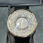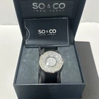 Elevate your accessory game with the SO&CO New York Women's Quartz SoHo Crystal Studded Leather Strap Watch. This luxury timepiece boasts a stunning blue diamond pattern on a silver crystal case, with a black leather strap that adds a touch of casual elegance to any outfit. With water resistance up to 50m and a 12-hour dial, this watch is both functional and fashionable. The push/pull crown and quartz movement ensure accurate timekeeping, while the gemmed details add a touch of glamour. This watch comes in its original box and is a must-have for any watch collector or fashion-forward woman.