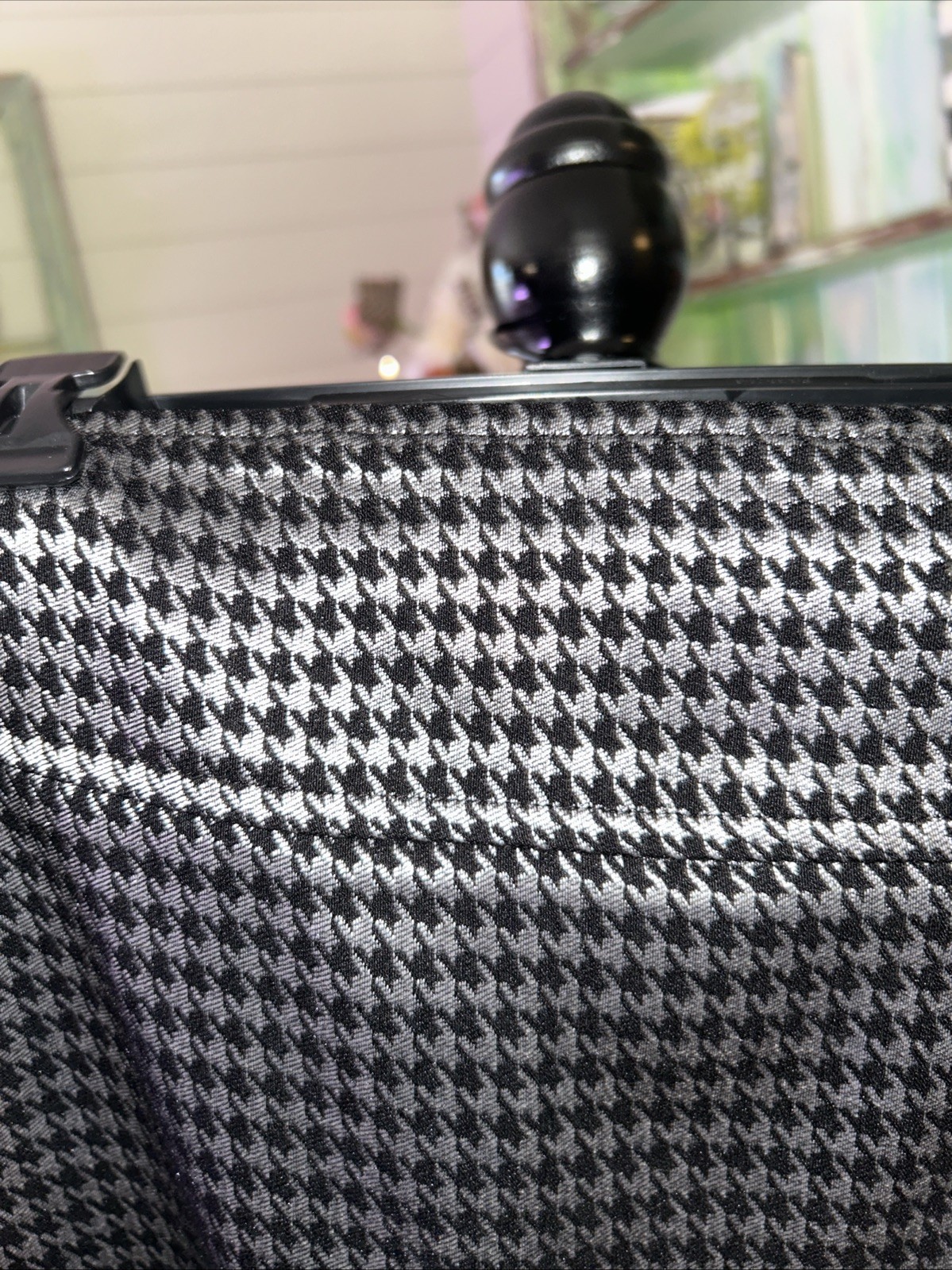 Soho Apparel Ltd presents a stylish Women's Knee High Skirt in size XL. This A-Line skirt has a Houndstooth pattern with a Pull On closure. It is made of a blend of Polyester, Nylon, Spandex, and Rayon, which makes it stretchable and comfortable to wear. The skirt is perfect for various occasions, including Party/Cocktail, Casual, Workwear, and Business events. The skirt is black in color and has a silver shimmer, making it perfect for any season, including Winter, Summer, Fall, and Spring. It is recommended to hand wash only to maintain its quality. This skirt is made in Vietnam and is not personalized or handmade.
