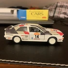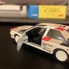 This is a 1:43 scale Audi Quattro diecast model of the San Remo 1981 rally car by Solido. Made in France, it features opening doors and is part of Solido's collection series. The car is white in colour and replicates the iconic Audi Quattro design from 1980, appealing to collectors and enthusiasts of classic rally cars.
