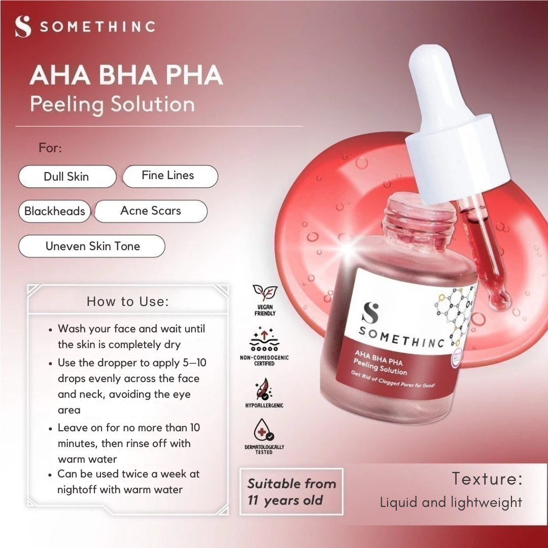 ✨ SOMETHINC AHA BHA PHA Peeling Solution – 20ml This gentle exfoliating facial serum by SOMETHINC combines AHA, BHA, and PHA to support smoother-looking skin by helping remove dead skin cells and unclog pores. Formulated with botanical extracts and hydrating ingredients, this water-based serum is suitable for all skin types , including beginners in chemical exfoliation. 🌿 Key Benefits (with regular use): ✔️ Helps cleanse clogged pores ✔️ Supports the removal of dead skin cells ✔️ Helps improve the appearance of post-acne marks ✔️ Helps maintain skin hydration and smoothness ✔️ Suitable for all skin types ✔️ Gentle enough for beginners 💧 Hero Ingredients: Glycolic Acid (3% AHA): Helps remove buildup and excess sebum Salicylic Acid (1% BHA): Supports acne-prone skin and oil control Lactobionic Acid (2% PHA): Provides hydration and mild exfoliation Niacinamide: Helps maintain skin moisture and even out skin tone Panthenol (Vitamin B5): Helps soothe and support the skin barrier Daucus Carota Leaf Extract & Hibiscus Extract: Known for their antioxidant properties 🧴 How to Use: Apply on clean, dry skin (avoid eye area) Use 5–10 drops across the face and neck Leave on for 10 minutes , then rinse with water Use only 1–2 times per week , preferably at night Follow with hydrating toner and moisturizer Always wear sunscreen the next day ⚠️ Notes: pH level: 3.5–4 Recommended for ages 11+ For external use only Discontinue use if irritation occurs 📦 Product Details: Brand: SOMETHINC Product Name: AHA BHA PHA Peeling Solution Net Volume: 20ml Texture: Lightweight liquid/serum Certification: BPOM No. NA18200100487 🌱 Clean & Conscious: ✅ Halal certified ✅ Fungal acne safe ✅ Alcohol-free ✅ Cruelty-free 💧 Discover smoother, more refined skin with SOMETHINC’s beginner-friendly exfoliating solution. A great addition to your nighttime skincare routine! ALL THE PRODUCTS ARE BRAND NEW AND AUTHENTIC! Disclaimer In case of having side effects such as red rash, swollenness and/or itching while using this skincare or cosmetic, or in case such symptomps appear by direct sunlight after using it, consult a dermatologist immediately. Precaution for treatment and storage. Keep out of reach from children. Avoid the place where the direct sunlight Product Condition We always distribute health and beauty products in its original manufacturer packaging the size writing on each of the packaging labels based on the net measurement. Sometimes you may find the container does not have the full capacity, but that doesn't determine that we are cheating or reducing the content. Some of the products may come with a sealed package; some may not, and we do not accept complaints about non sealed containers since they are beyond our capacity. Shipping We ship from Indonesia using economy international shipping We will process your order within 1 to 3 business days . Estimate arrival date is between 12 to 30 business days depend on your location Please note that delivery dates aren't guaranteed and may include extra transit time because of unforeseen delays. Late deliveries are always a possibility; however, we will try our best to ensure all deliveries arrive on time For holiday seasons, shipping will take longer time to reach. Please be patient when awaiting your item. Please make sure your shipping address is correct before you place an order. Your address must include a contact phone number. This is very important since shipping company require it. Our prices not include local taxes and tariffs which may apply in your region. Customers outside of Indonesia may be subject to customs fees and/or import duties and taxes, which are levied once a shipment reaches your country. Additional charges for customs clearance must be borne by you; we have no control over these charges and cannot predict what they may be. Customs policies vary widely from country to country. You should contact your local customs office or tax authority for information specific for your situation. Return: If you having any problem with the product, please chat us first within 30 days before requesting a refund. We will assist you If item has already shipped and you decide you do not want it or you want to ask for item's replacement, please return the item within 30 days and make sure it's in a good condition. Return shipping is the buyer's responsibility unless the return is a result of our mistake or otherwise stated. And if you decide to ask for money back (after receive the item), refund will be given m inus Shipping Cost. Feedback If you are satisfied with our service, please give us a 5-stars positive. If there is any problem, PLEASE contact us before leave any negative feedback. Your satisfaction is our priority. Thank you for visiting us and for your purchase. Please contact us with any questions you may have.