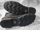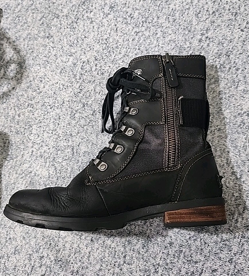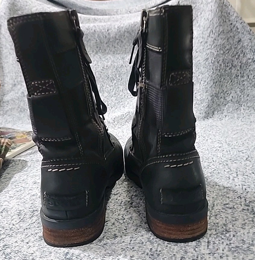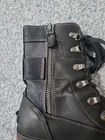 The SOREL Emelie Conquest Leather Waterproof Combat Boots in Black, size 7.5, are a versatile and stylish choice for women. With a comfortable low heel and molded rubber outsole, these boots are perfect for travel, rainy days in the city, casual outings, and workwear. The lace-up and side zipper closure adds a secure fit, while the waterproof feature makes them ideal for winter and fall seasons. The leather upper and canvas/synthetic lining ensure durability and comfort, making these boots a reliable choice for any weather condition.