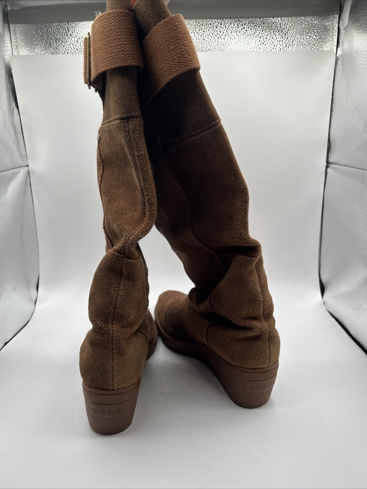 SOREL 'Toronto' Brown Suede Wedge Heel 15" Tall Boots Women’s Size 8.5 Pre-owned. Very nice used condition. Some wear as shown. See pictures.