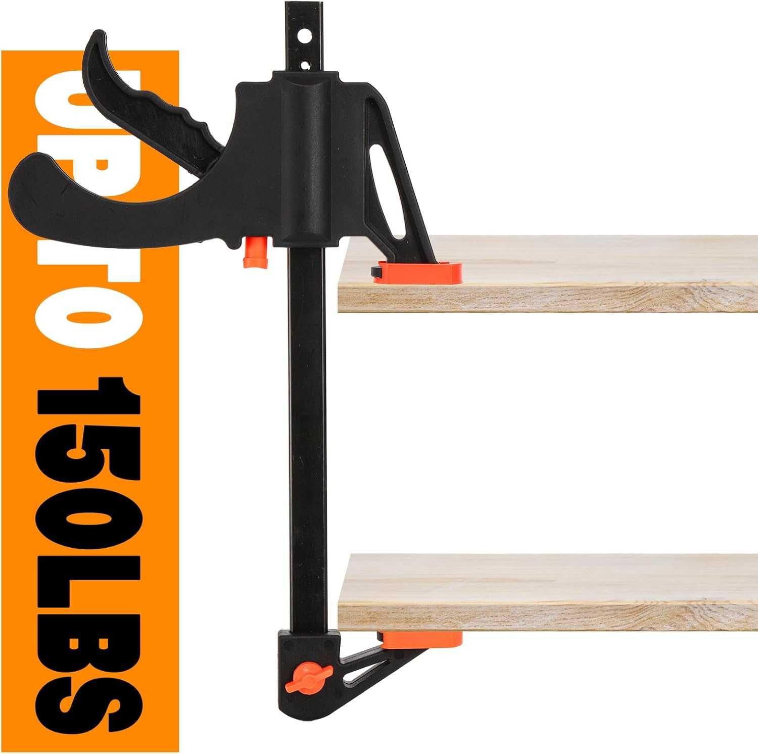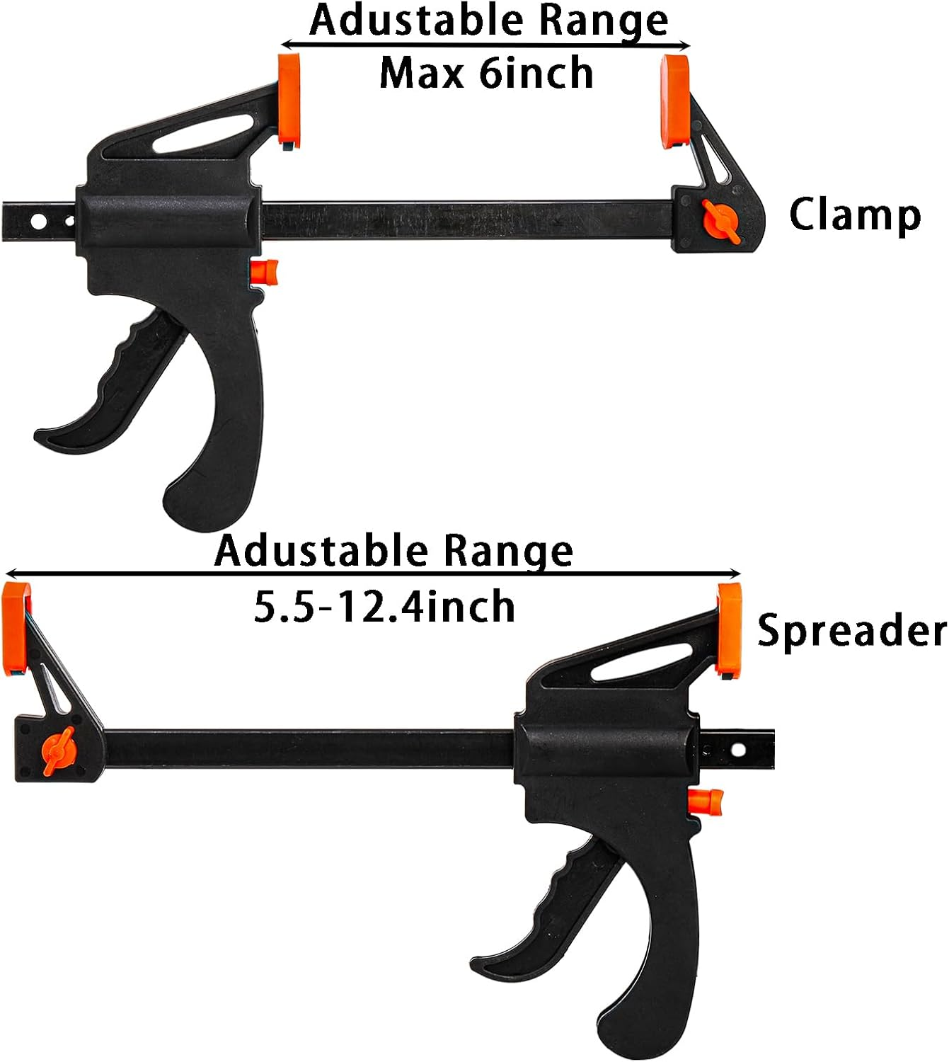 Package: Include 4 pack 6'' bar clamps. The 6" clamps can be set to spreaders of sizes up to 11-9/64". Clamping capacity up to 6 in, throat depth 2-1/8 in High Quality Steel: SOUJOY F clamp is made of high quality hardened steel with soft pads, provide great impact resistance, which is totally able to withstand the heavy use expected on construction sites Easy to Use: Simply adjust the jaws and pull the push handle to clamp or release the work-piece, and the opening capacity can be easily adjusted. Also can be a spreader, just push the red button,remove the jaws,then reverse it and put it back in place Up to 150LBS Clamping Force: The pads of quick trigger clamps are made of resilient materials and non-slip textures, that provide a larger area of thrust surface, enhances the overall clamping force. Soft pad protects your project Multi Purpose: These bar clamps are suitable for woodworking assembling, welding, gluing projects, handicraft making, etc. Perfect for professionals, amateurs, DIY hobbyists, carpenters and cabinet makers Product Description SOUJOY 4 Pack 6 inch Wood Clamps for Woodworking, One-Handed Bar Clamp/Spreader Specification Color: Black Materials: Steel, plastic Size: 6inch Applications: Woodworking assembling, gluing projects, handicraft making, etc. Package included: 4 Pack F Clamp Quick Trigger Clamps F Clamp Quick-Release Latch Makes it so easy to take them off your project or adjusts the fix in seconds Up to 150LBS With up to 150 lbs of squeeze capacity and metal ratchet construction Non-marring Pads Larger pads provide a larger area of thrust surface, more balanced force and parallel clamp. Non-marring, non-slip texture protects your project High Quality Clamps for Woodworking Strong nylon body and high-quality hardened steel bar have good impact resistance Quick-Clamp Just push the red button, remove the jaws, then reverse it and put it back in place to get the spreader you want. Multi Purpose These bar clamps are suitable for woodworking assembling, gluing projects, handicraft making, etc. Perfect for professionals, amateurs, DIY hobbyists, carpenters and cabinet makers.