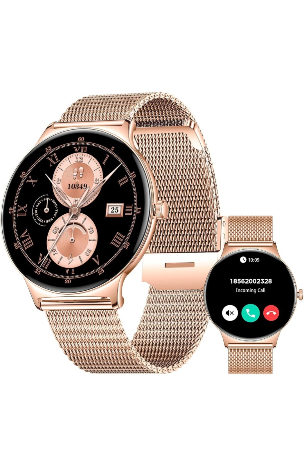 The Reloj Inteligente smart watch is a fashionable and functional accessory designed for women. With a sleek gold round case and matching gold plated band, this smart watch is both stylish and practical. It boasts a battery life of 10.0 days, ensuring that you can wear it for extended periods without worrying about charging. Compatible with both iOS and Android operating systems, it offers a range of special features including time display, sleep monitoring, email notifications, and calendaring. Perfect for staying connected and organized on the go, this smart watch is a must-have for tech-savvy women.
