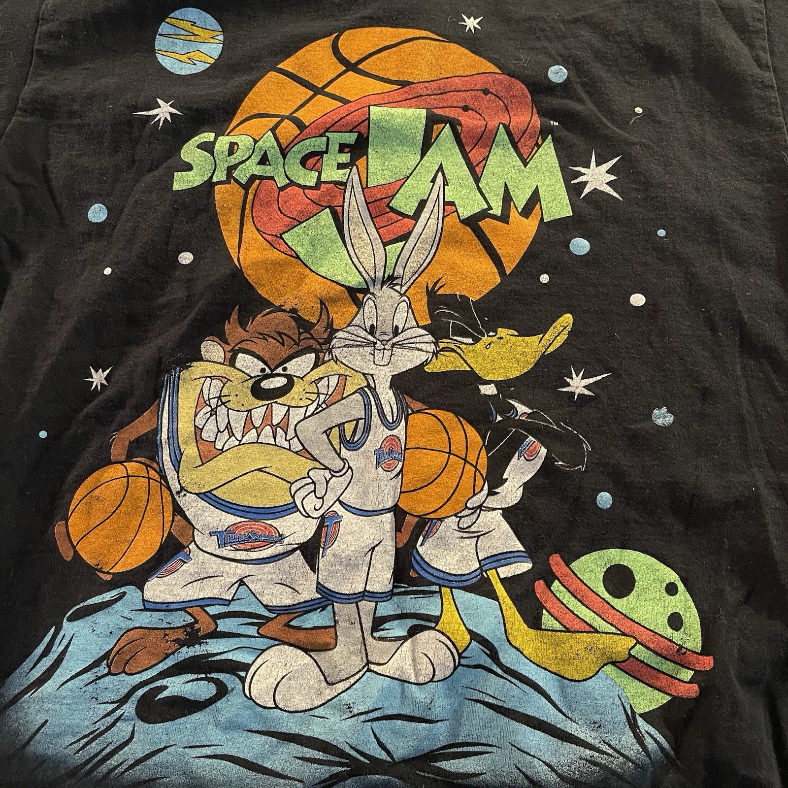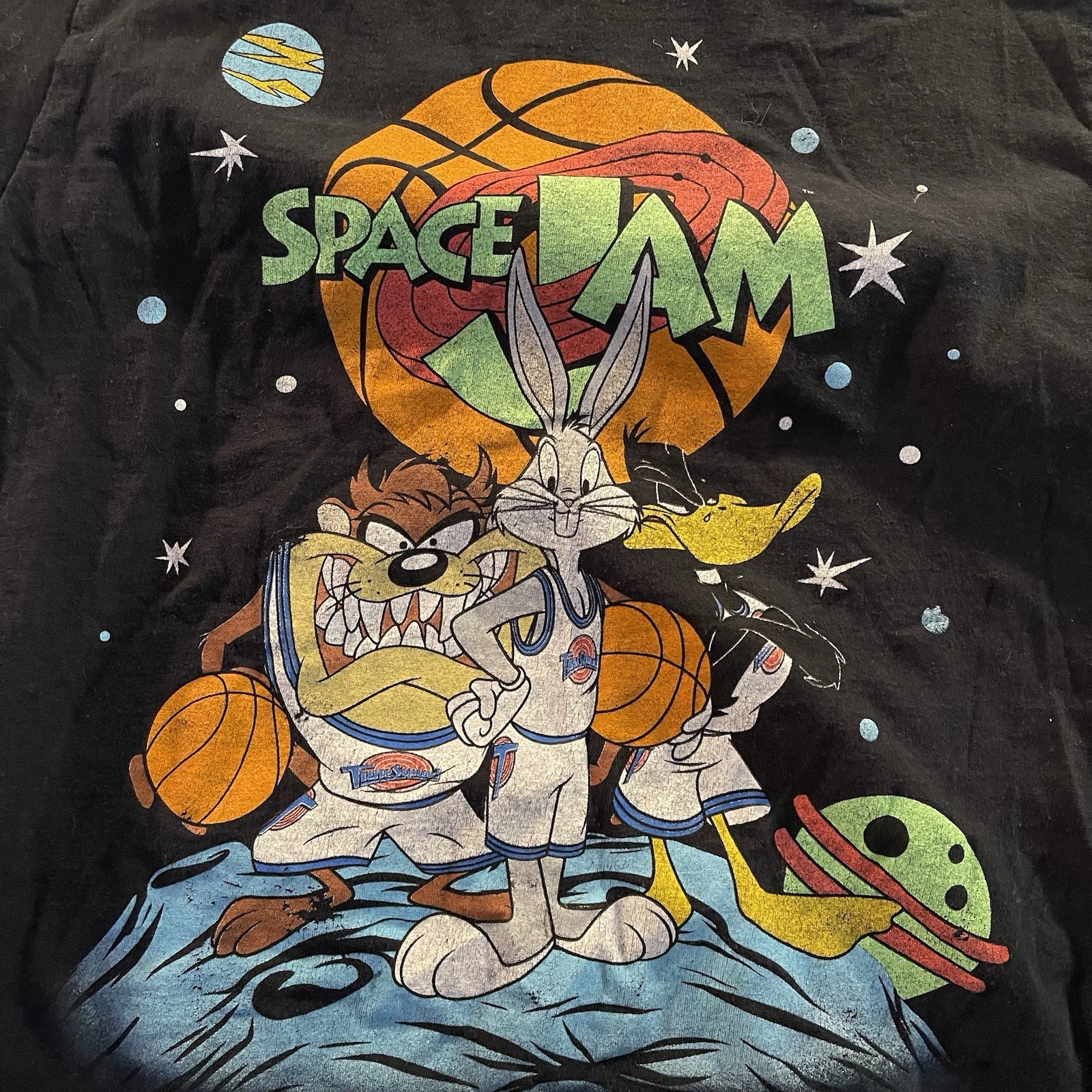 The SPACE JAM Cotton Men's M Crew Black T-Shirt Bugs Taz Daffy Basketball features a regular fit with a crew neck and short sleeves, made from comfortable cotton material. The black t-shirt showcases iconic characters from the Space Jam movie, such as Bugs Bunny, Daffy Duck, and Taz, making it a fun and nostalgic addition to any man's wardrobe. Perfect for fans of basketball and classic cartoons, this t-shirt is a unique and stylish piece that celebrates the beloved Space Jam franchise.