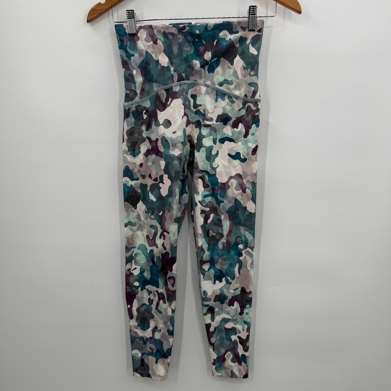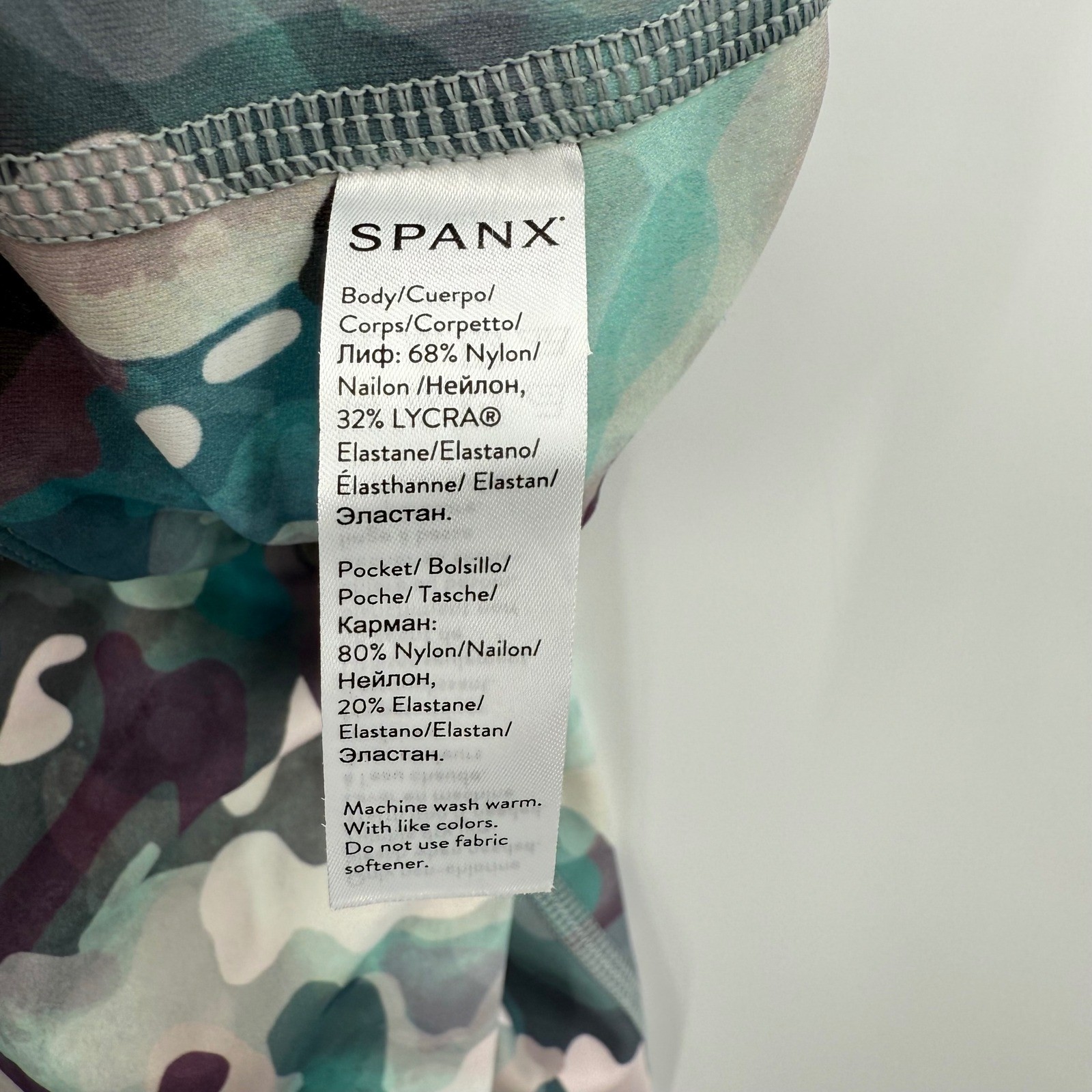 Camouflage print activewear leggings offering comfort and style. These leggings are designed with a high waist and a cropped length, making them a versatile addition to your workout wardrobe. The fabric blend provides a smooth feel and excellent flexibility for movement. Featuring a flattering fit and a distinctive camouflage pattern, these leggings are perfect for your fitness routine or casual wear. Measurements: • Waist: 24" • Rise: 9.5" • Inseam: 23" Department: Women Style: Cropped Type: Leggings Performance/Activity: Yoga, Pilates, Walking, Hiking, Cross Training Leg Style: Skinny Compression Area: Waist, Abdomen Theme: Camouflage, Outdoor, Military Features: Stretch, Moisture Wicking, Breathable, Pockets Occasion: Activewear, Casual Keywords: SPANX leggings, women's leggings, high waisted leggings, cropped leggings, camouflage print