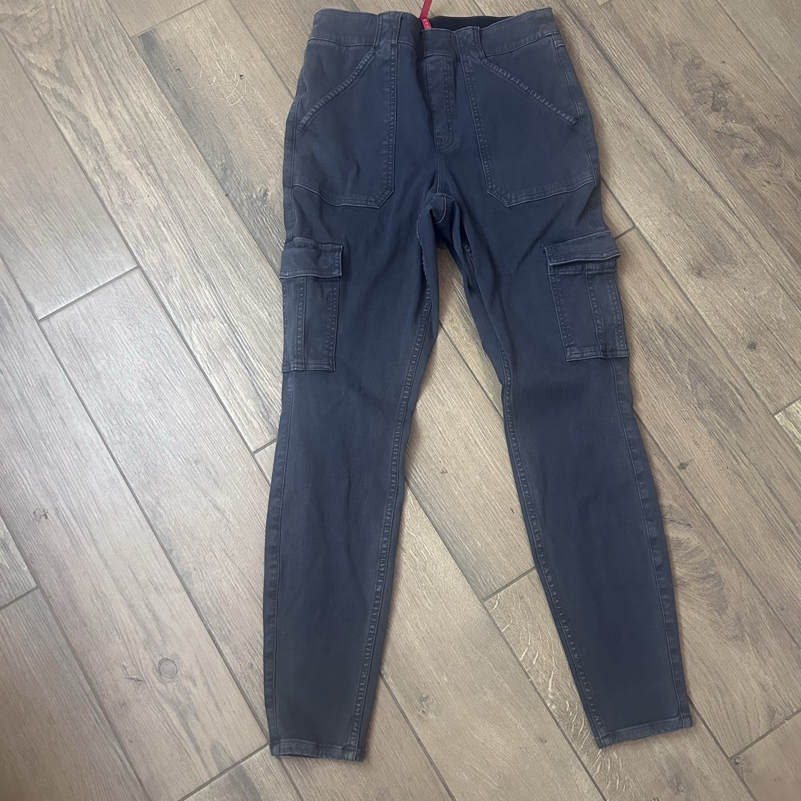 The SPANX Cargo Twill Ankle Pants in Women's size S, waist 28, are versatile pants suitable for travel, casual wear, and workwear. Made from cotton twill fabric, these cargo-style pants feature an elastic waist, stretch material, and pockets for added convenience. The ankle length, mid-rise fit, and skinny leg style provide a flattering silhouette. Perfect for all seasons, these gray pants are machine washable for easy care and are adorned with a logo accent, making them a stylish choice for modern women on the go.