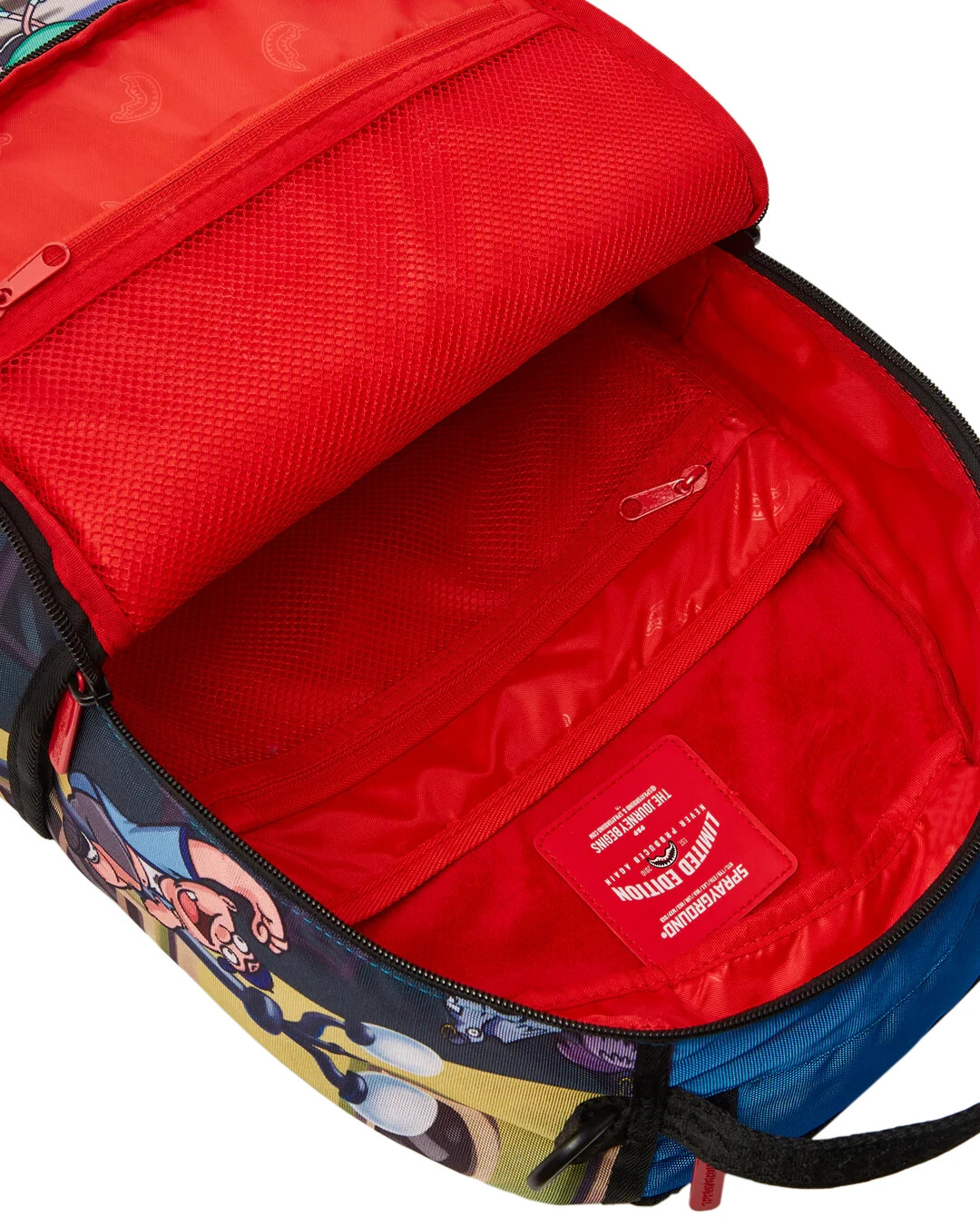 This is a Sprayground Hey Arnold Anniversary Backpack (DLXR) in a large size, designed for unisex adults. It features a multicolor design with faux leather and polyester materials. The backpack is part of the Sprayground brand and is styled with the iconic Hey Arnold theme. DLXR = 100% RECYCLED POLYESTER FABRIC PRODUCT DETAILS Exterior Dimensions: 18" x 6" x 11.5" ∙ Front zipper pocket ∙ Side pockets ∙ Zippered Stash pocket ∙ Ergonomic mesh back padding ∙ Adjustable Straps for custom sizing ∙ Nylon Zippers with Metal Hardware ∙ Metal "Sprayground Authentic" badge ∙ Slide through back sleeve connects to Carry on luggage to free your hands Interior Separate Laptop compartment ∙ Separate Velour sunglass compartment ∙ Mesh organizer pocket Fabric Durable 900D Poly water-resistant fabric 100% RECYCLABLE MATERIAL