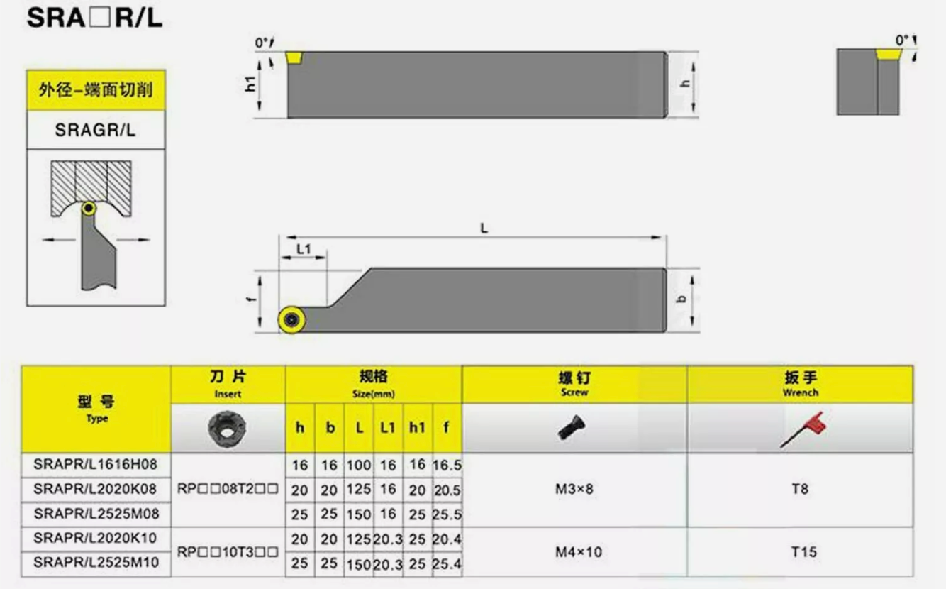Model: SRAPR 1616H10 Shank D: 16mm Shank L:100mm Screw: M4x10 Wrench : T15 Accept Insert : RCMT10T3MOE-JS LF6018