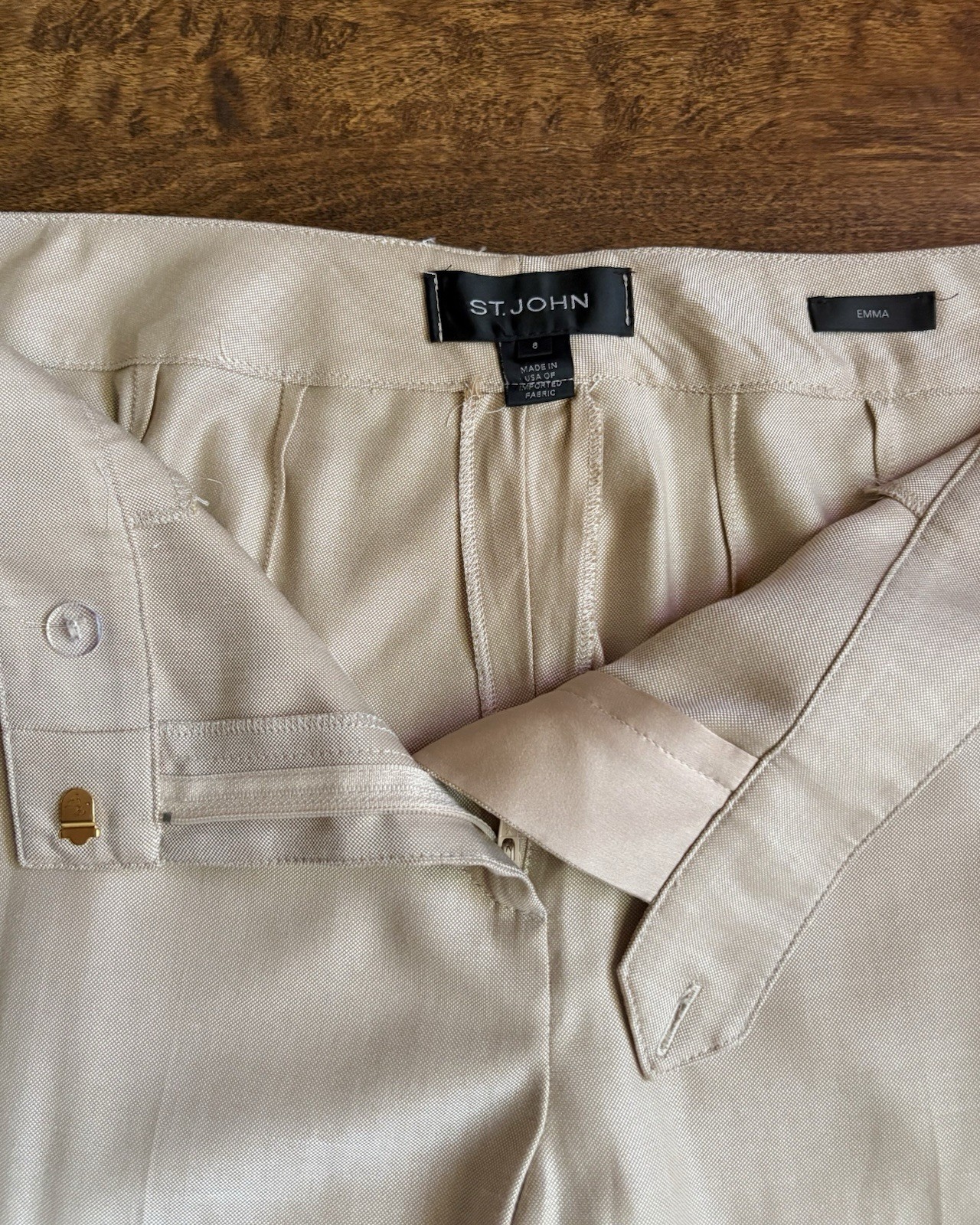 Elegant St John Emma trousers made with a silk and wool blend in a neutral light beige shade. These trousers have been previously tailored/altered. Current measurements: Waist: 31 inches Inseam: 25.5 inches Care tag has been removed, so the exact fabric composition ratio is not known, but these should be dry cleaned. Fabric is light, soft, and flowy, but not stretchy. There are no pockets (front pocket lines are ornamental). In excellent used condition.
