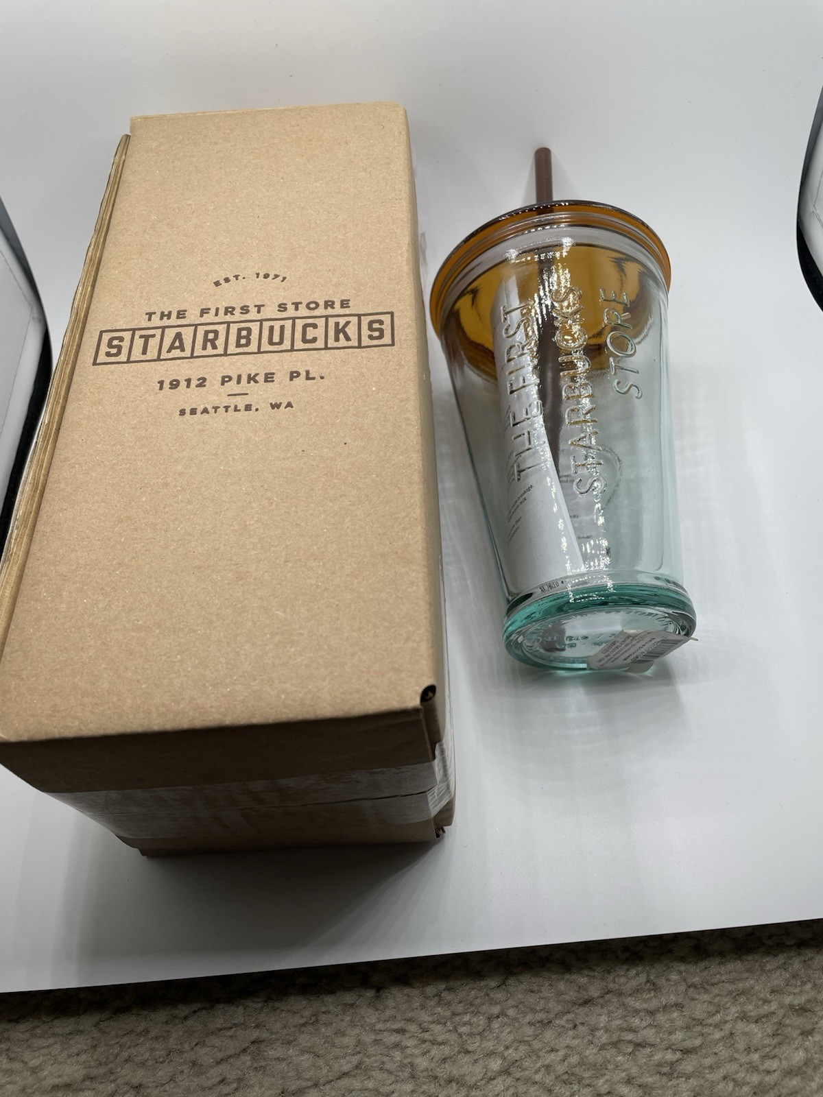The STARBUCKS Recycled Glass Cold Cup 16 oz Grande First Store Pike Place Brown is an original collectible item featuring the iconic Starbucks brand and coffee theme. Made from recycled glass, this brown cup is a unique and sustainable piece that showcases the history and style of the Pike Place store. Perfect for coffee enthusiasts and collectors alike, this cup is a must-have for those who appreciate the Starbucks experience.