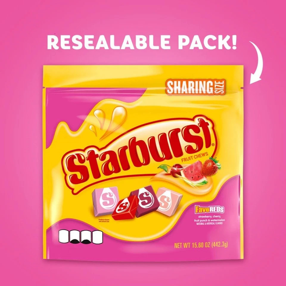 STARBURST FaveREDS Fruit Chews Chewy Candy, Sharing Size, 15.6 oz Bag FREESHIPPI About this item Flavor FaveREDs Item Form Chews Unit Count 15.6 Ounce Number of Items 1 Contains one (1) 15.6-ounce resealable sharing size bag of STARBURST FaveREDS gummy candy mix Fruit-flavored, chewy red/pink candy with a soft, chewy texture promised an experience that's different every time Each sharing size bag of candy has enough chewy STARBURST individually wrapped candy pieces to share with all your friends and family The resealable candy bag makes it easy to take the juicy goodness of STARBURST candy on the go STARBURST FaveREDS Chewy fruit candy features strawberry, fruit punch, watermelon, and cherry flavors for party candy and old school candy lovers