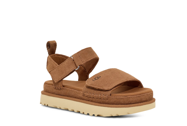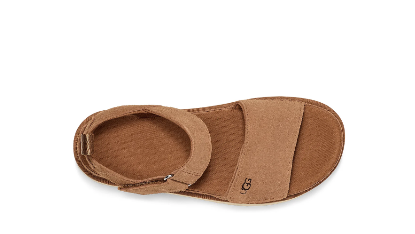 STEAL THIS DEAL! UGG® Goldenstar Strap Sandals, Chestnut (Authentic) ABOUT THIS PRODUCT This is the Goldenstar. It's a match made in warm weather heaven. This is the sandal that feels like the Classic UGG® Boot. Crafted from velvety suede and made with an ultra-cush, but supportive foam footbed and a lightweight outsole for all-day wear. Two sets of adjustable straps provide a fine-tuned fit for comfortable days on the go. Adjustable ankle strap, Adjustable vamp strap, Hook-and-loop closure Textile lining made from 100% recycled polyester fibers, Microfiber lining Sockliner textile made with 100% recycled polyester, Sockliner incorporates peppermint-based anti-odor treatment Contoured EVA footbed The UGG® logo, heat-embossed 11261143 COMPOSITION Composition Suede upper Rear pull tab made from 100% recycled polyester fibers Sugarcane EVA midsole made with recycled EVA regrind Sugarcane EVA outsole Recycled polyester binding