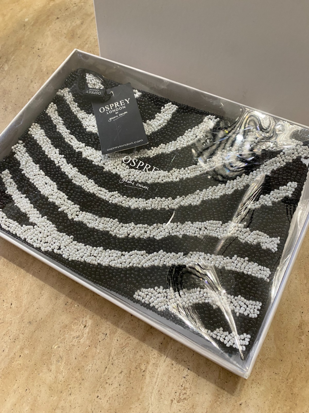 OSPREY ZEBRA BLACK & WHITE BEADED POUCH The exquisite quality and style of each hand made accessories is ideal to pair with your favourite Outfit… spending has never been so well coordinated! Quality, workmanship, is characterized by color, print, and the love for detail. A sensational line of designer items which aims to help you express your own style statement. This beautiful collection is designed especially for the freespirited, and offers a relaxe d sense of urban style which is totally unique. Be free to create your own sophisticated look with this The sweetest gift for a loved one or yourself. Brand new in box, original price £85.00 Check out my other items ! Be sure to add me to your favourites list ! If you have any questions do not hesitate to contact me. I post out six days a week. Thankyou for looking. x