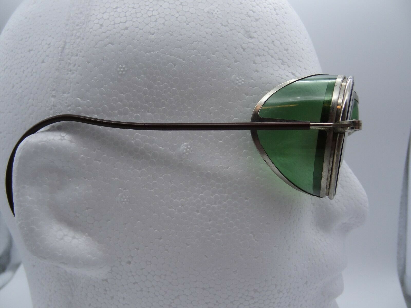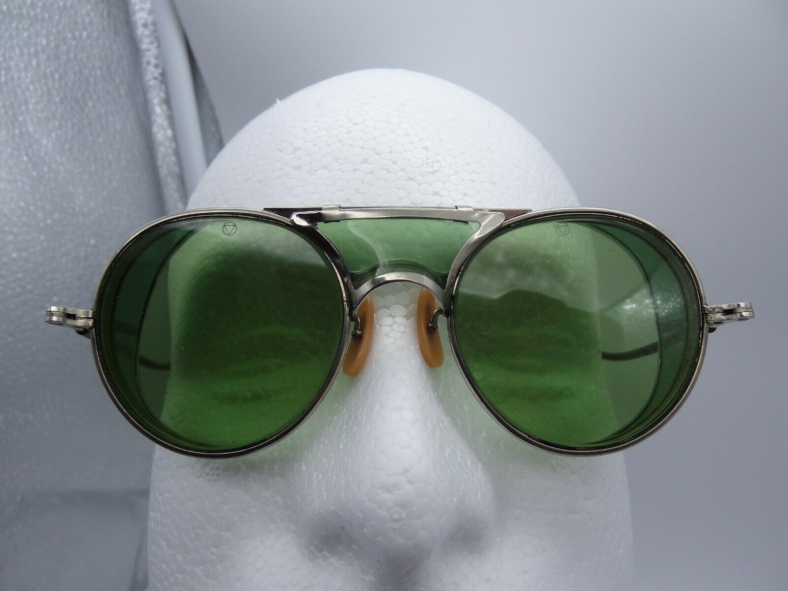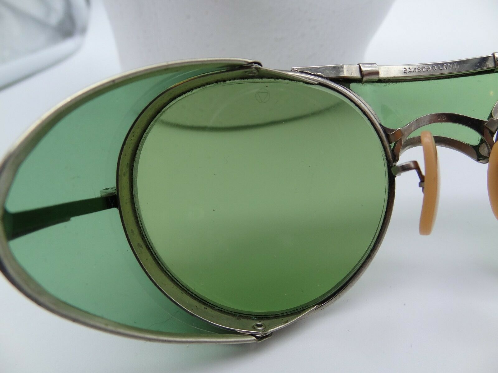 Up for consideration it this very nice pair of vintage Bausch and Lomb green glass safety glasses. These have the swivel side protection. The bridge of the nose says Bausch and Lomb. There is a symbol of a triangle in the center of a circle on the glass. These would make a great statement. Thank you for stopping by my store today. Please can you share my store with your friends and family? Have a great rest of your day. Clementine.