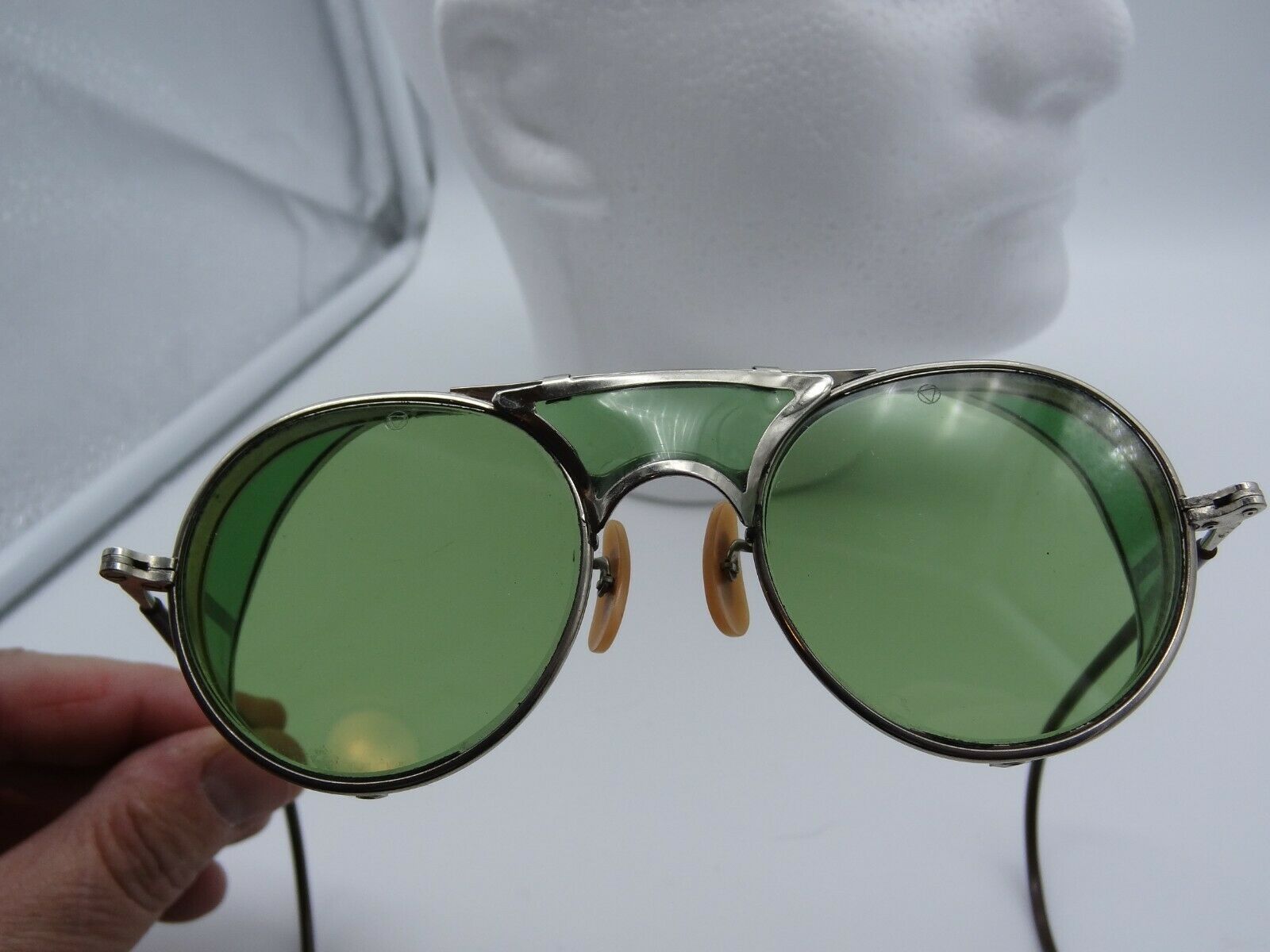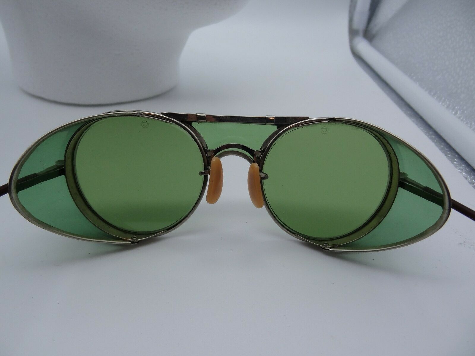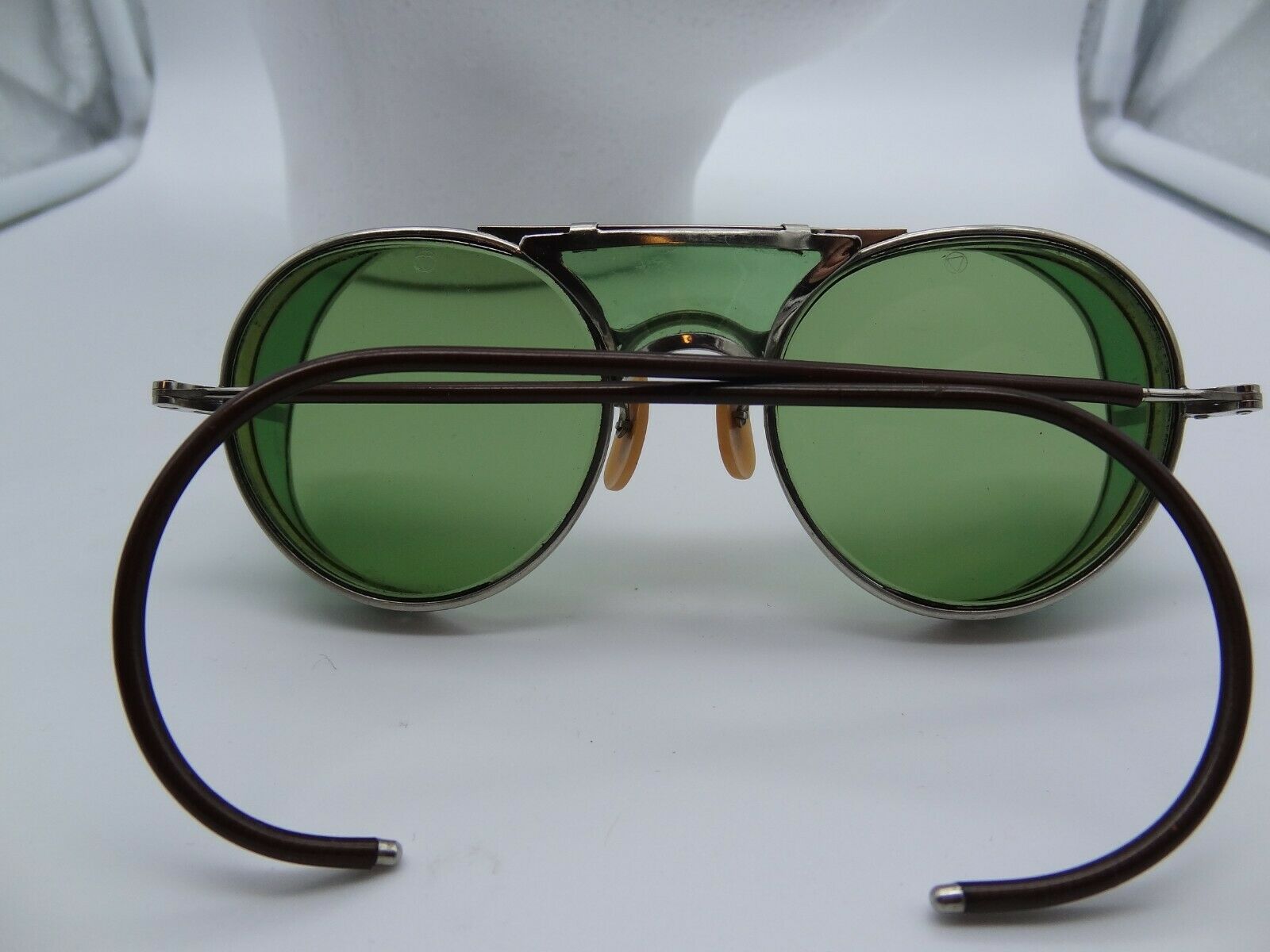 Up for consideration it this very nice pair of vintage Bausch and Lomb green glass safety glasses. These have the swivel side protection. The bridge of the nose says Bausch and Lomb. There is a symbol of a triangle in the center of a circle on the glass. These would make a great statement. Thank you for stopping by my store today. Please can you share my store with your friends and family? Have a great rest of your day. Clementine.