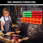 SWANLAKE Wall Mounted Storage Bins Garage Rack Organizer Baskets Organizations 30PCS are the optimal solution for storing and organizing everything from fishing tackle, office supplies, hand tools, nuts, screws, and bolts, to crafting materials, beads, or toys. And you can keep items within reach and neatly organized at all times 1.30PCS adjustable and removable bins make a easy organization of parts and tools. 2.Three bright color bins make a better distinction and the perfect angle make enough space for fetching. 3.The container is wall mountable,save space,easy to assemble and disassemble. 4.Durable Construction for Heavy Duty Use, Can hold a wide assortment of items, ideal for bench tops or mounting to a wall. 5.The pack includes 9pcs small red bins ,9 pcs small green bins and 12pcs large orange bins,2 mounting board and 8 wall fixing screws for storing and organizing tool accessories