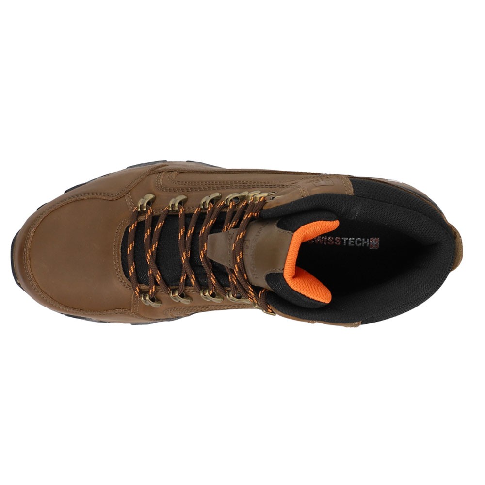 Snow Hiking Boots PG128 Product Details Leather upper Lace closure Padded tongue and collar Waterproof Rubber outsole These boots from Swiss Tech are a must-have for your next hiking adventure. These shoes feature a leather upper and waterproof technology to keep feet dry. Additional Details Color: Brown Occasion: Casual Gender: Mens Age: Adult Brand: SWISS TECH