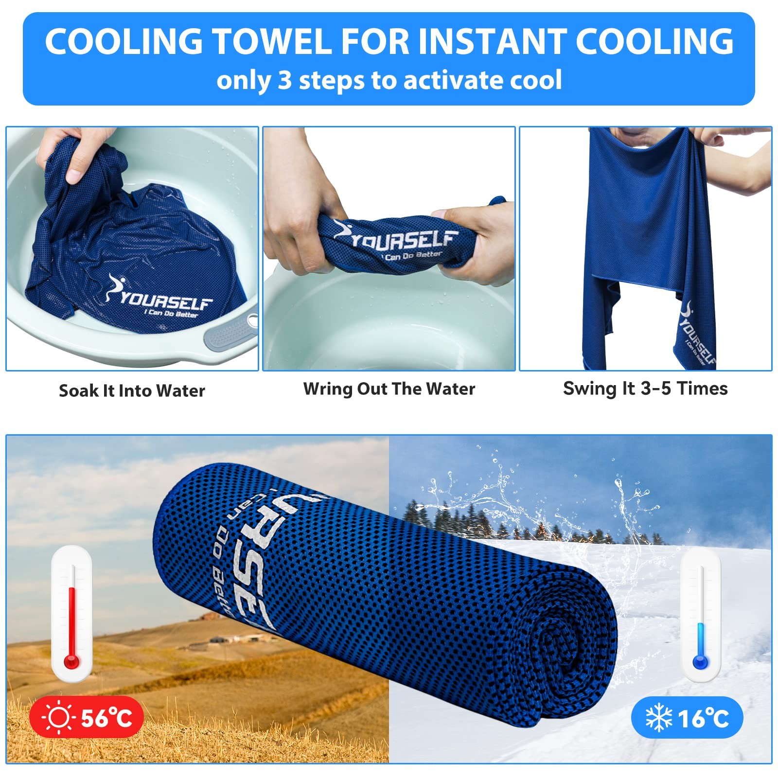 INSTANT COOLING TOWEL REUSABLE - cooling towels for neck and face quickly cools down by just soaking, wringing the water out and snap. The magical cooling effect can easy to reactivate it by repeating the same steps. ice towel - cooling that lasts for 3 hours. Everyone can use cooling towels, even pets.e the cooling towel, even pets FASHION, COMFORTABLE FIT - cooling towel provides a pleasing color scheme, decent size (40"x12" large enough to meet your needs) and lightweight. It’s soft breathable and attractive to use in public and a perfect size to be a sports towel, sweat towel, scarf, scarves, headband. It's just the right size to wrap around your neck or head. The edges are smoothly finished and the exquisite stitching prevents the 4 semicircular corners from unraveling. Use cooling towels any place for hot weather BREATHABLE, VERSATILE - works on the physical evaporation of moisture. No chemicals are used in the making of the chilly towel, perfect for hot weather, outdoor activities, indoor exercise, sports, athletes, fever or headache therapy, heatstroke prevention, sunscreen protection, cooling while absorbing. Cooling neck towel keep you cool during hot summer days, workout sessions, outdoor adventures or when someone has a migraine SOFT TOUCH, GREAT GIFT - Soft and cool microfiber material cooling towels for neck and face would be a thoughtful father's and mother's day gifts for your families or friends, also for sports enthusiasts, kitchen staff, outside workers, warehousing employee, who need a neck towel to keep cool. Neck coolers absorb heat or sweat quickly and takes a fair amount of time to lose its cooling effect but just snap cooling towel in the air and it gets it all back BONUS - nice portable pouch(CE APPROVED). Each cooling towel come with a waterproof carrying pouch along with a carabiner to attach or fit into your bag, which takes up a little room and weighs a little in your backpack or your purse when you are planning on a travel or outdoor activity. Portable cooling towels for hot weather allows you to feel cool anytime in the summer heat!