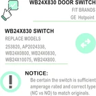 Product Description Monitor Door Switch WB24X830 Description: WB24x830 door interlock switch works in conjunction with microwave operation. The switch will prohibit the microwave from starting when the microwave door is open. Typically if the light & turntable works or the fan & display (countdown) works but the oven doesn't heat, it is most likely because a door switch has gone bad. Works with the following models: General Electric CVM2072SM1SS, EVM1750DMBB01, EVM1750DMWW01, EVM1750SMSS01,JE1540AW02. WB24x830 Microwave Switch(Normally closed) Single Pole, Single Throw (SPST) VDE certified (Europe) CSA certified (Canada) UL certified (US) Note: The placement of the common terminal SZM-V16-FD(FA)-62 is different from SZM-V16-FD(FA)-63 Micro Switch WB24x830 Monitor Switch Snap Action Microswitch 0.6A 125VDC 0.3A 250VDC 16A 1/2HP 125/250VAC T130 16A 250V ~ T130 5E4u Microwave Door Switch SZM-V16-FD-62 Replaces: 253820, AP2024338, EAP237422, PS237422, WB24X0800, WB24X0830, WB24X10075, WB24X800. Works with the following brands: General Electric, Hotpoint Works with the following products: Microwave, Microwave Oven Combo, Range How to replace WB24X830 Switch? Unplug the microwave power at first. Open the microwave door, remove the grill through taking off two screws at the grill top; Remove the screw on the left holding the control panel in place, loosen the screw behind the panel, lift the panel up and pull forward to detach. Find the door switch by removing the screws to detach the switch assembly. Press on the release tab to remove the middle switch. Disconnect the wire connector to release the old switch. This switch fixes the following symptoms: Doesn’t shut off Won’t turn on No heat Notice: Be certain they are sufficient amperage rated and correct type (NC vs NO) to match originals. One can also use SPDT switches if only the appropriate NC or NO terminal is connected.