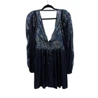 A show-stopping mini dress from Sabina Musayev. V-neckline, slightly defined shoulders, and exaggerated sleeves in a stunning. A pleated metallic fabrication designed to dimension and movement. Classic fit and flare fit, low cut back, zipper closure, adjustable strap along the top. New condition. Size Medium (approx, on hanger) pit-pit 15” flat waist 14” length 32” Color: metallic blue Tags: holiday party, New Year's, birthday dress, going out, Vegas, bachelorette, date night,