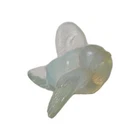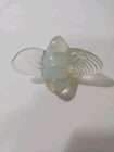 This is a vintage Sabino opalescent glass figurine of a bird, specifically a sparrow, with its wings out as if ready for flight. The piece is clear in color and has a 3D effect, featuring decorative details. It is signed by the artist and was made in France. The figurine showcases the brand's production style of opalescent glass. Good condition no chips