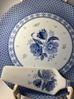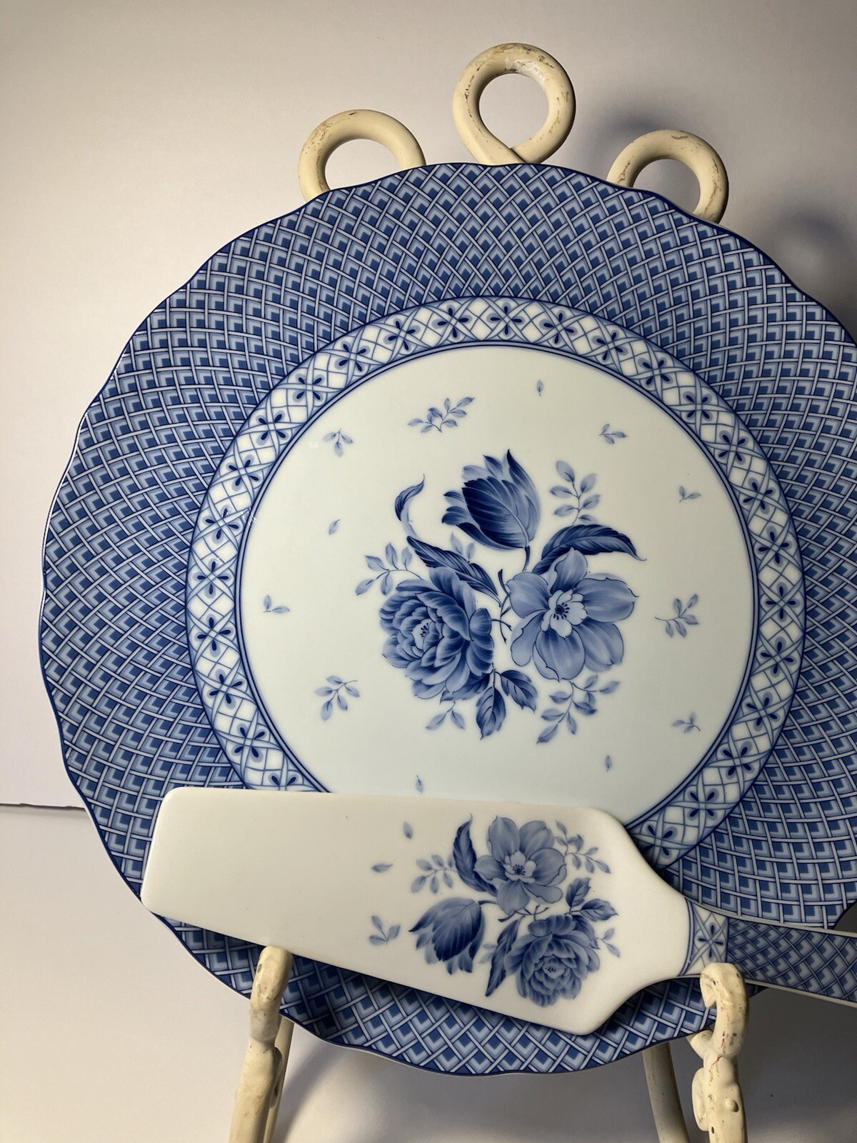 This beautiful cake plate and server set from Andrea by Sadek is a must-have for any occasion. The intricate blue rose porcelain finish adds a touch of elegance to any dessert table. Measuring 11 inches in width, this round serving piece is perfect for all occasions, whether it's a wedding or a casual get-together. Crafted in Japan in 1999, this vintage set is part of the Andrea by Sadek product line and features a floral theme of roses. The backstamp is printed and the production technique is unknown. This set includes two items and is perfect for adults. Add a touch of sophistication to your dessert presentation with this stunning cake plate and server set.